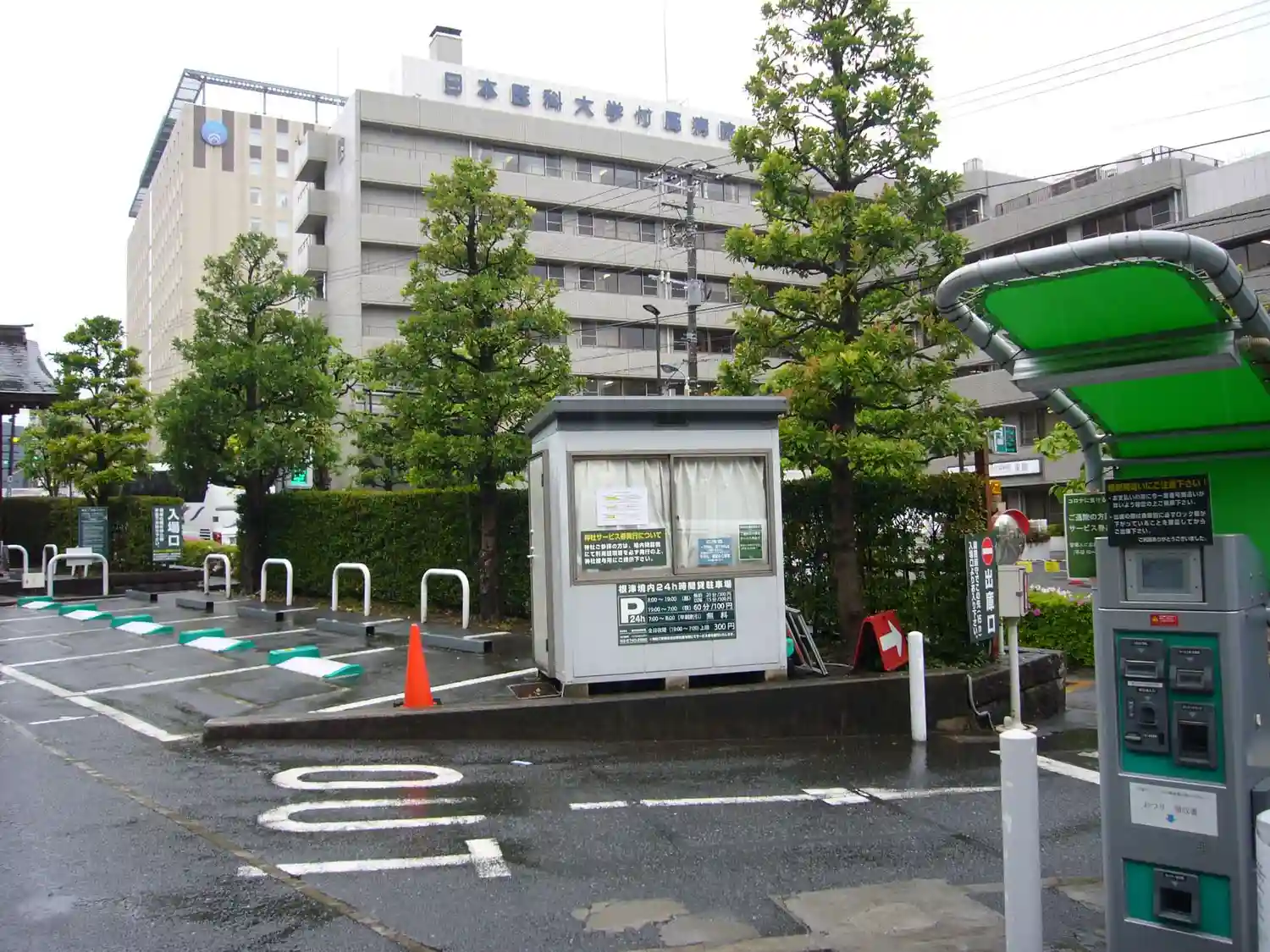 日医大病院前の駐車場に着きました。この駐車場の料金は、結構いいお値段です。
