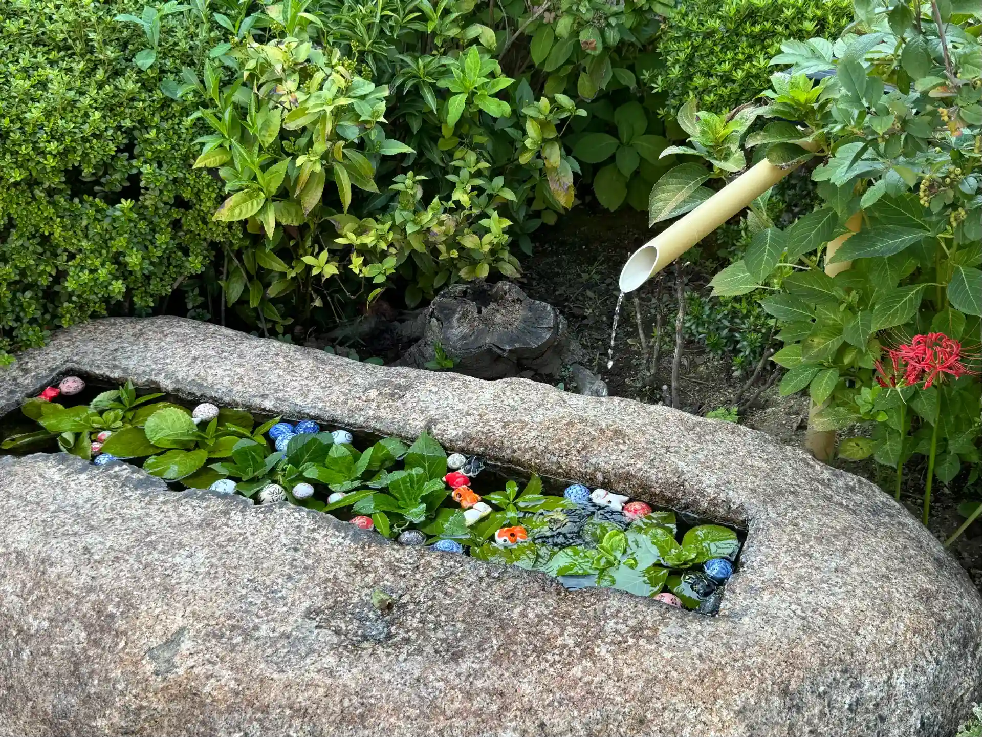 彼岸花に揚羽蝶が止まっていたり、綺麗な花手水があったりと、風情のあるお寺でした。