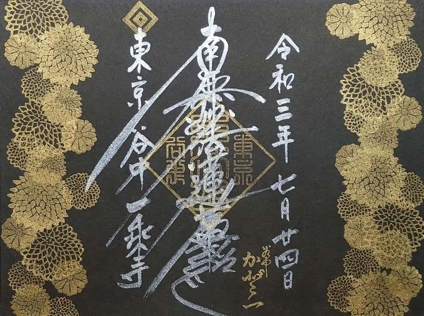 黒和紙に銀文字、金印、金菊Bで御首題を頂きました。