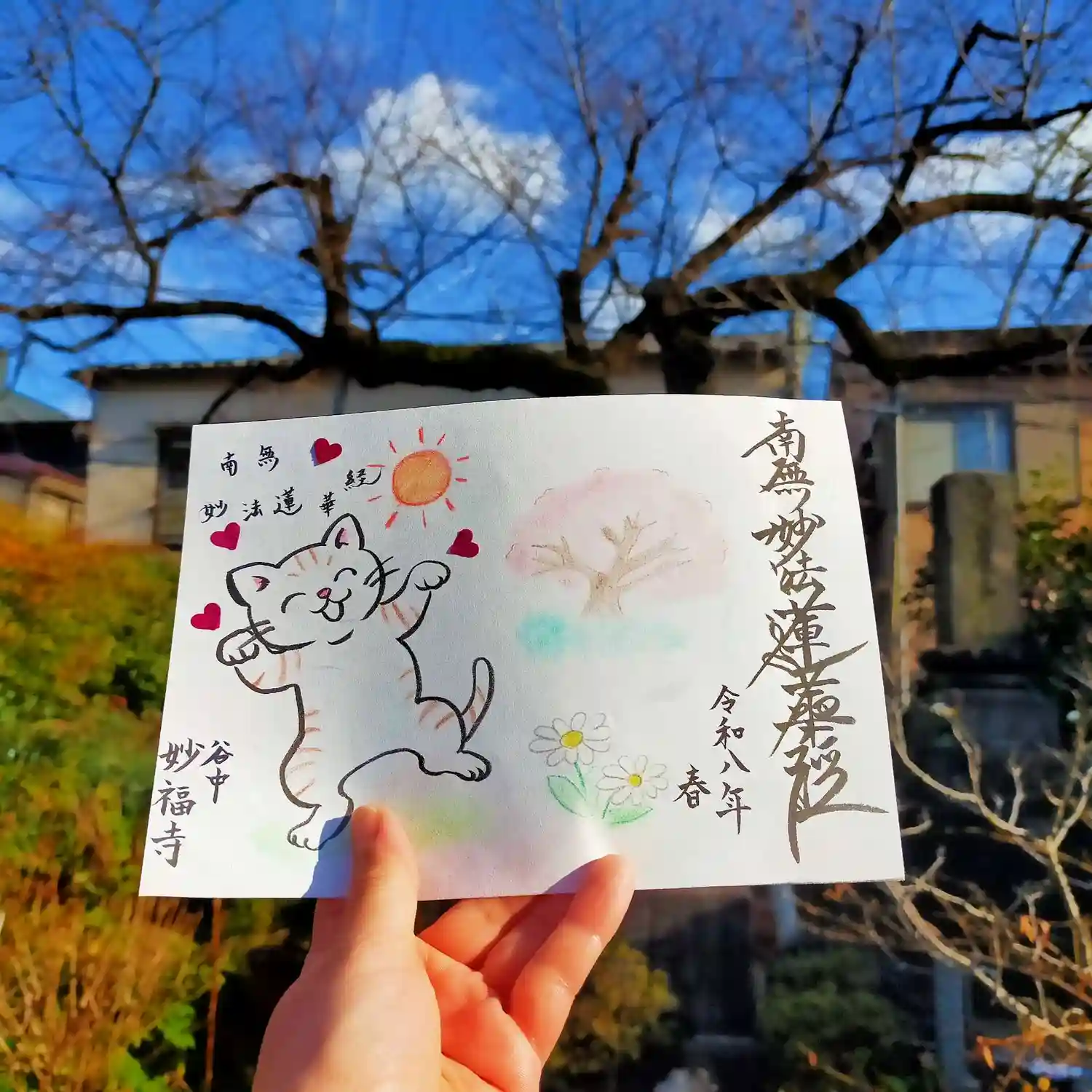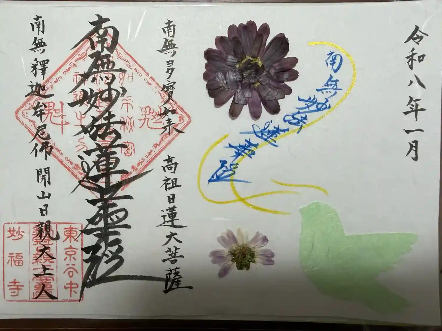 | 御朱印 | あり 毎月17日より、御首題(押し花バージョン)を配布致します。押し花は境内のお花を用いていますので、数に限りがあります(約20枚)。当面は書置きのみのご対応です。 |