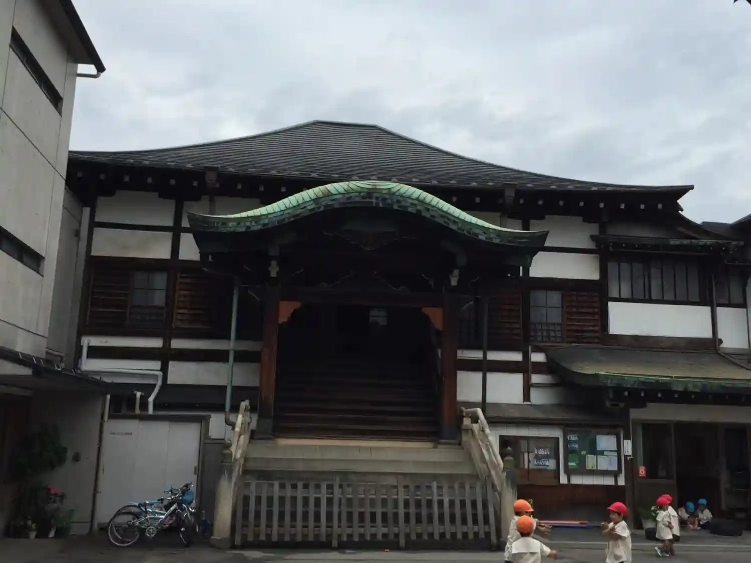 幼稚園が併設されたお寺。本堂に上がる階段から柵で仕切られており、本堂前まで…
