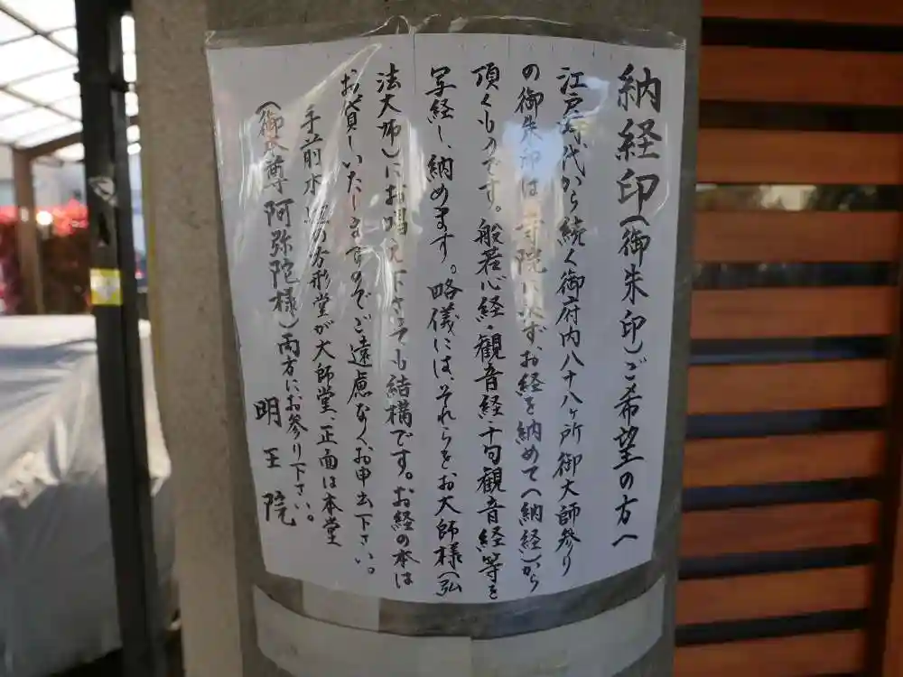 御府内八十八カ所の五十七番です。御朱印(納経印)は必ずお寺に写経を納めるか、略儀には弘法大師にお経を唱えてからいただくもの、との告知が掲げられていました。御府内の巡礼では、どこでもまず般若心経を唱えていますので、その旨を告げると、快く御朱印をいただけました。