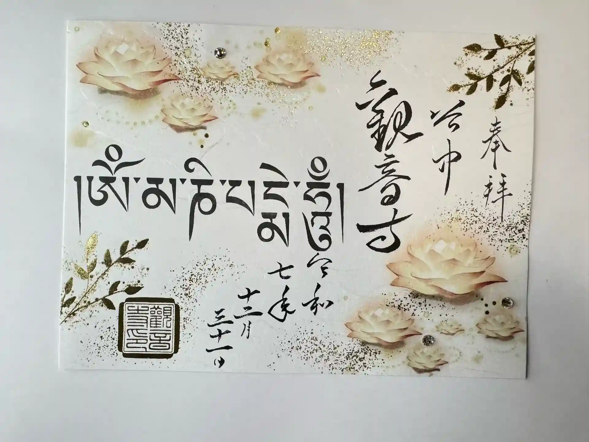 冬季限定切絵御朱印を目当てに伺ったのですが、珍しいサンスクリット語の御朱印もいただきました。ラインストーンが付いていて、キラキラして素敵です。