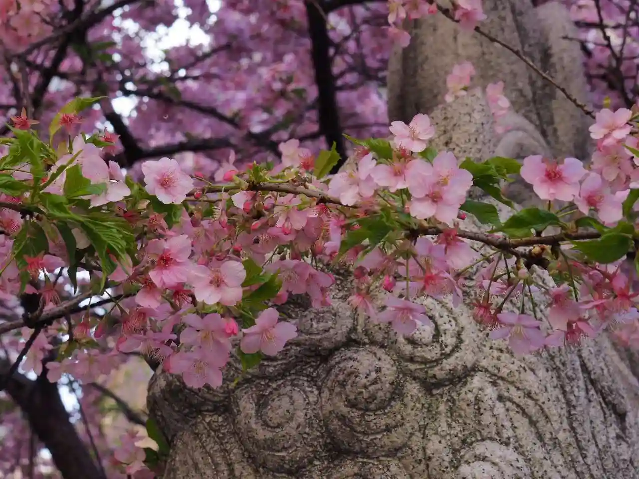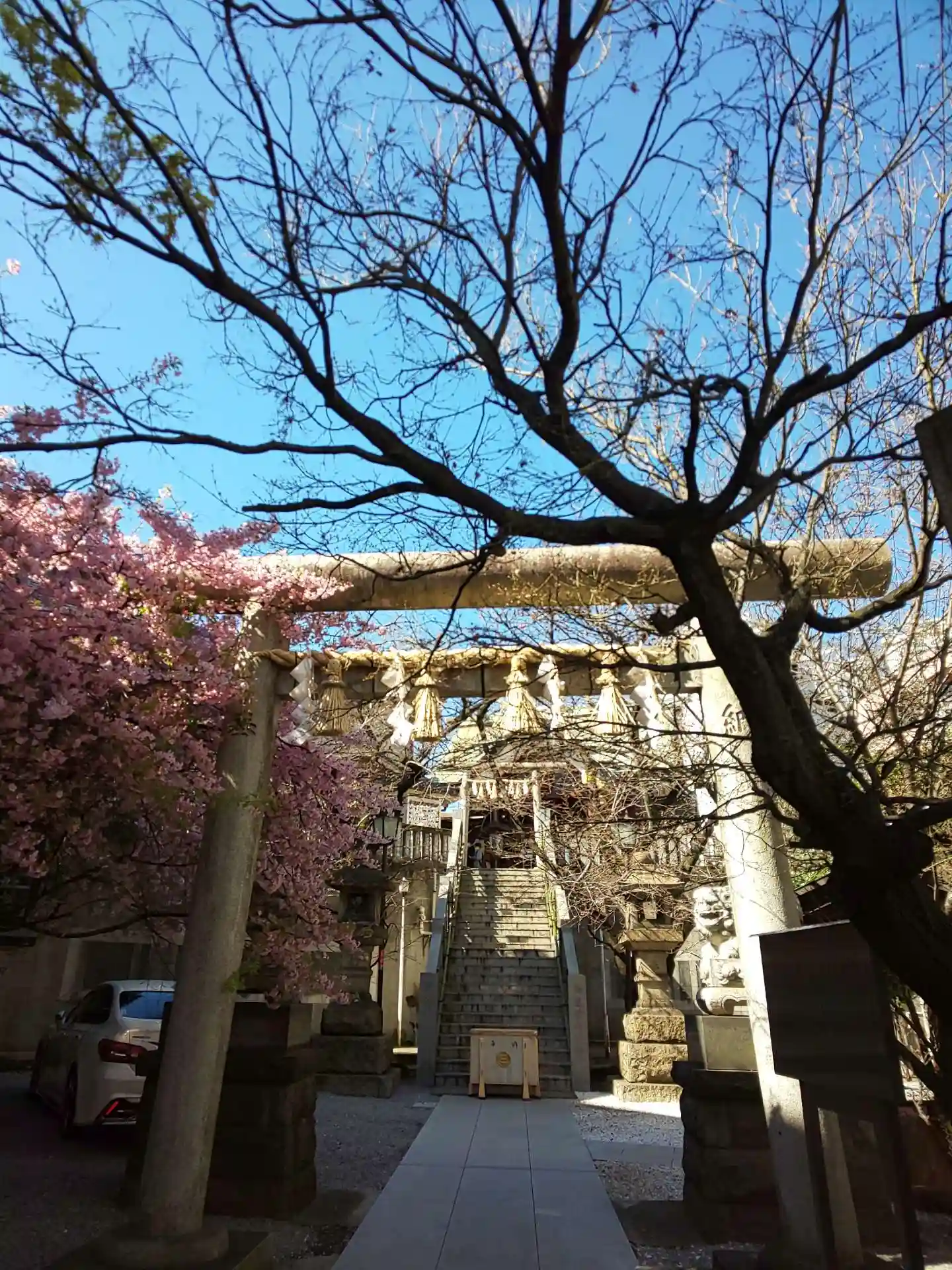 桃の節句の限定御朱印を拝受したく参拝しました。河津桜が見事に咲き誇り、狛犬さんが埋まってました。