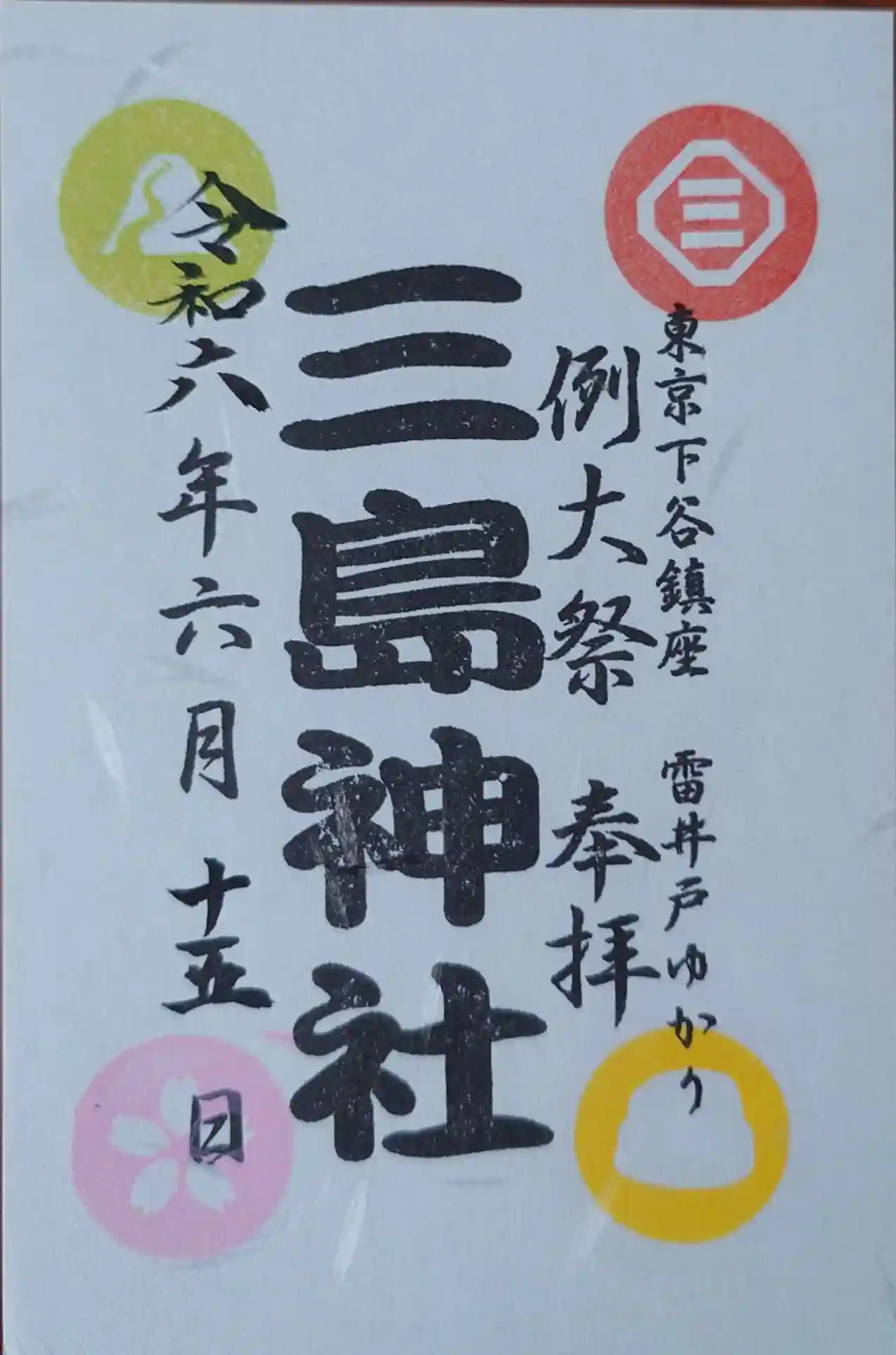 東京都台東区下谷にある三島神社にお参りに行きました。昨日から例大祭という事で、この暑い中、神社の周りには子どもたちが元気に子ども太鼓を引いていました。神社は建替え中で、プレハブに本殿と社務所が入っていました。期間限定の例大祭の御朱印と季節限定の御朱印を授かりました。