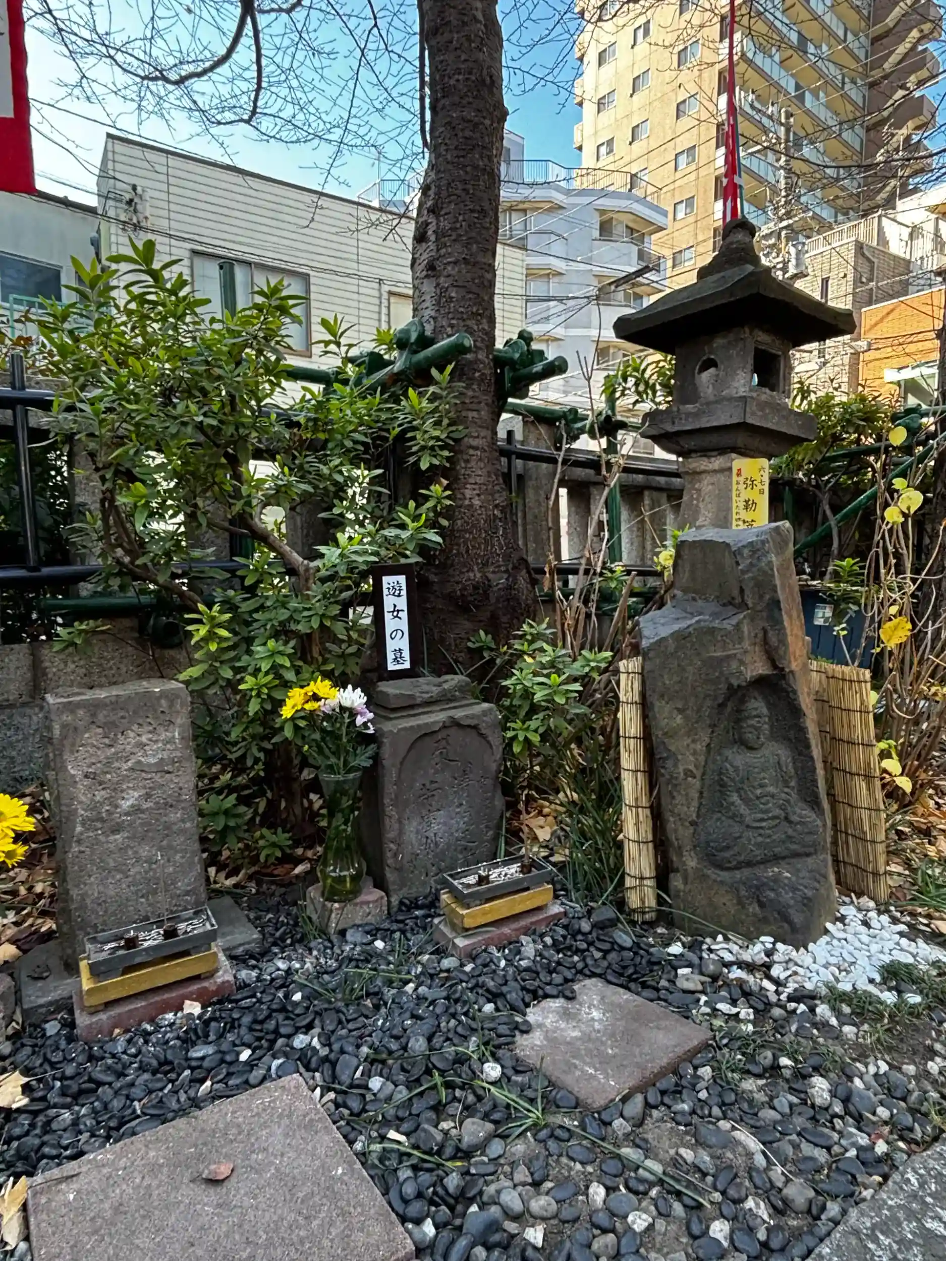 池は花園池・弁天池の名で呼ばれたが、大正12年の関東大震災では多くの人々がこの池に逃れ、490人が溺死したという悲劇が起こった。弁天祠附近の築山に建つ大きな観音様は、溺死した人々の供養のため大正15年に造立されたものである。昭和34年吉原電話局(現在の吉原ビル)の建設に伴う埋立工事のため、池はわずかにその名残を留めるのみとなった。(台東区教育委員会掲示より)