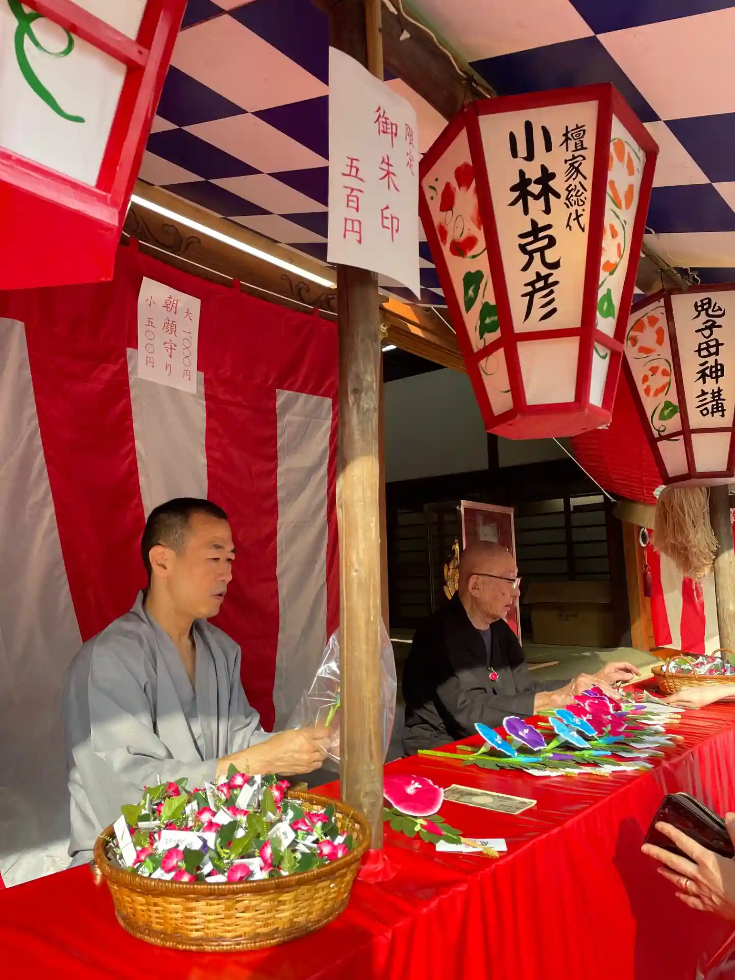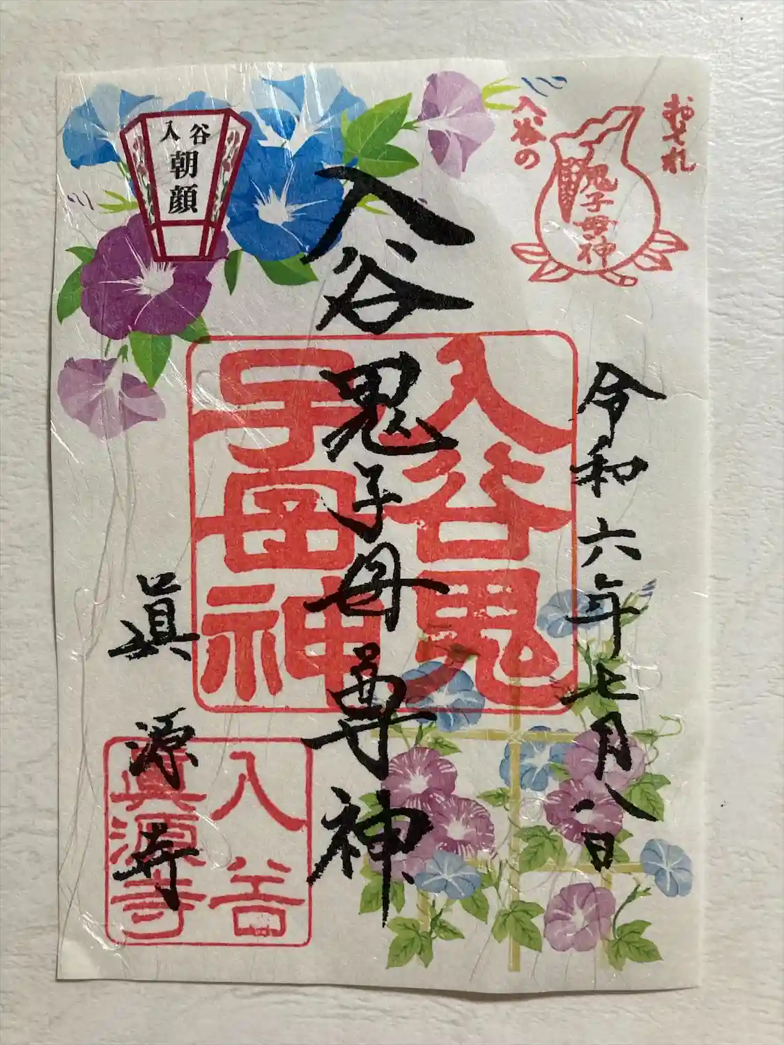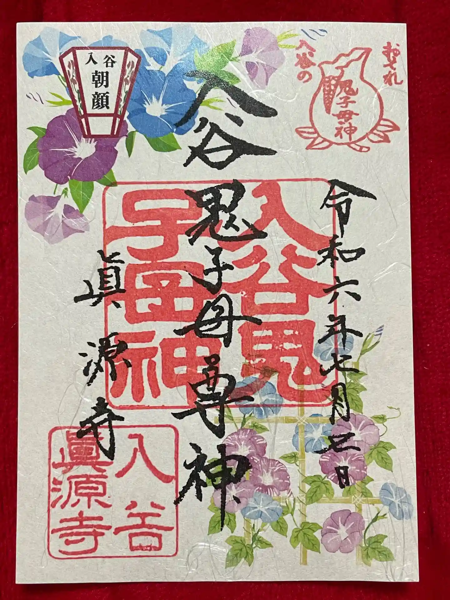 恒例夏の朝顔まつり、鬼子母神限定御朱印と朝顔の花の御守りをいただきました。団十郎という珍しい品種の…