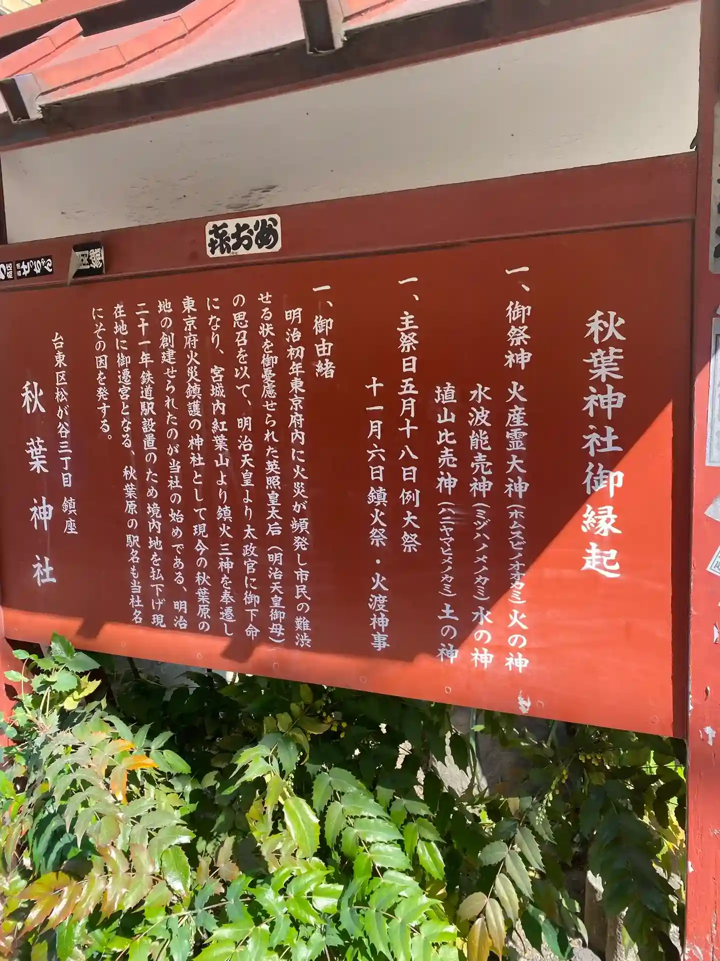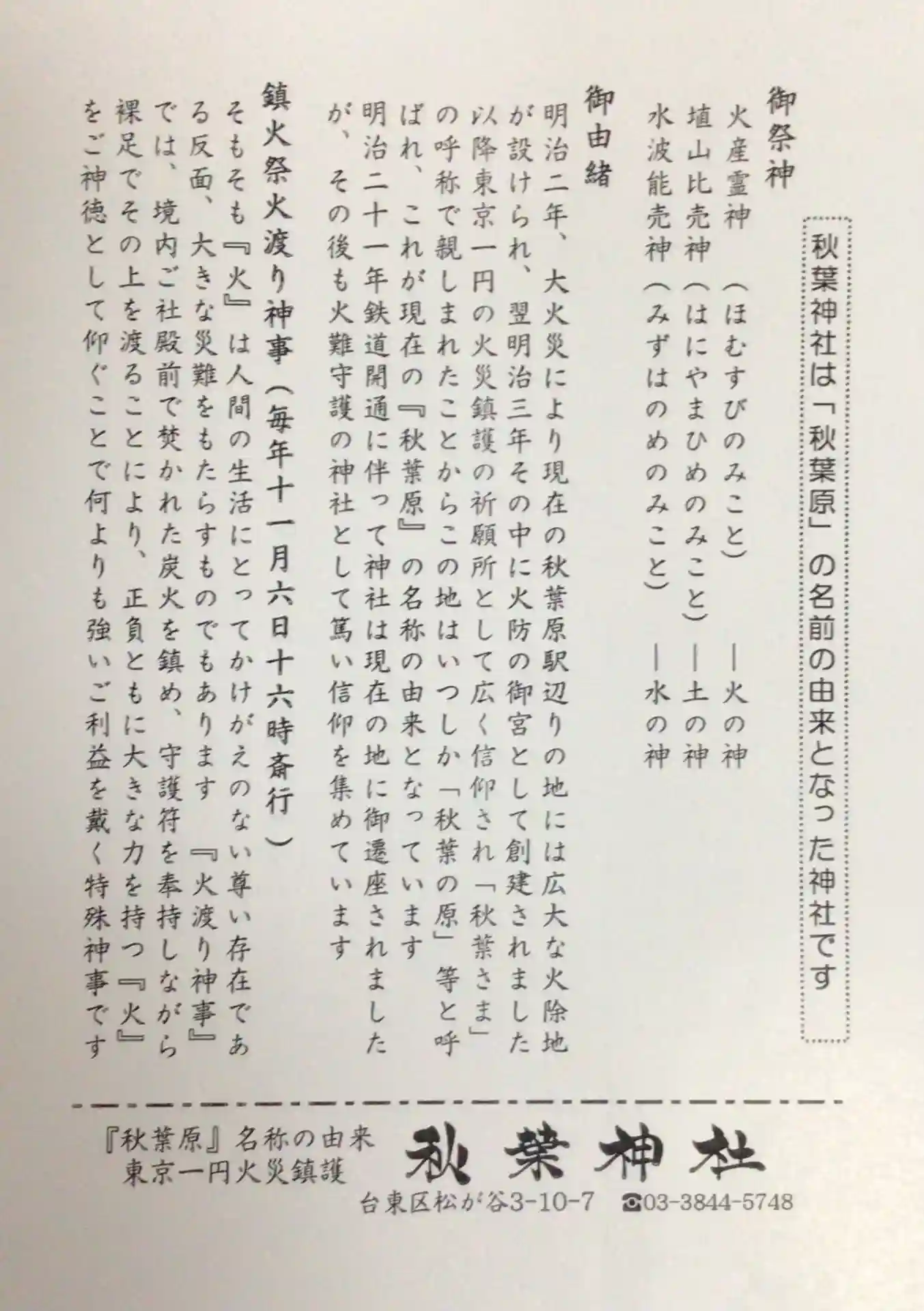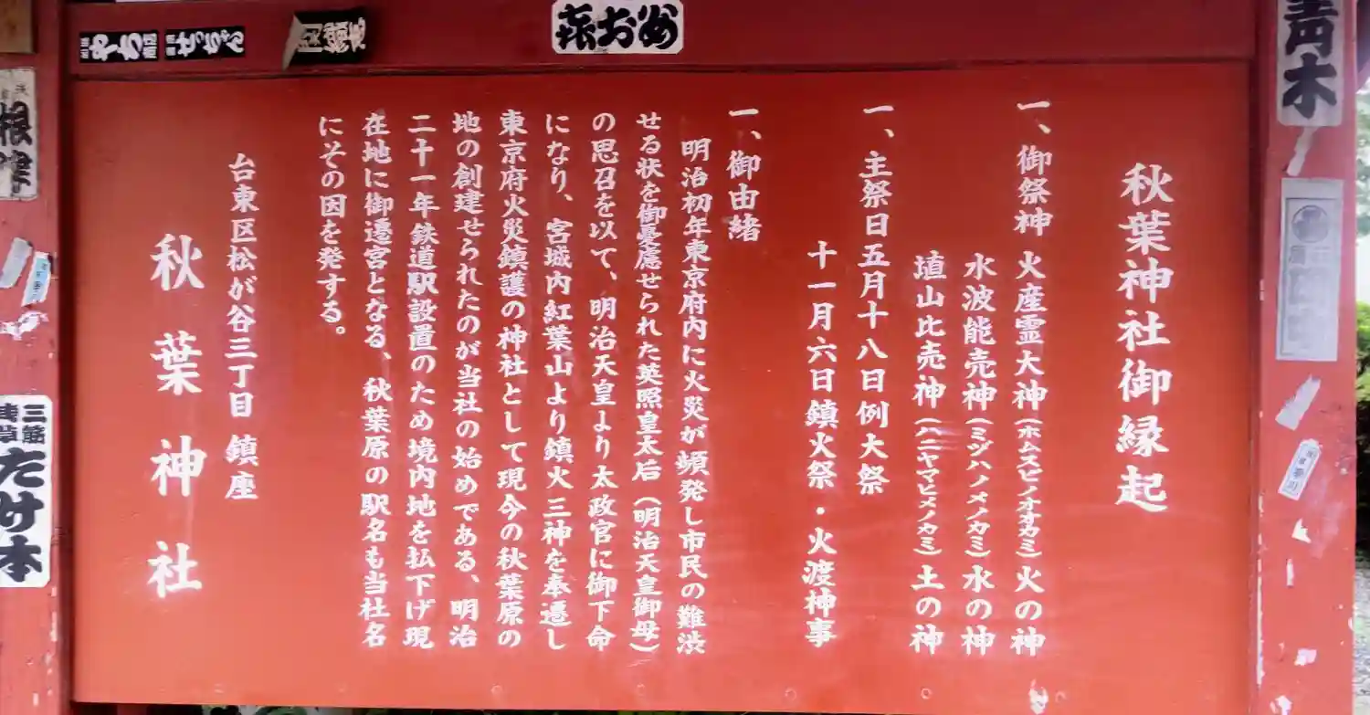明治時代に東京で火事が頻発して宮城内紅葉山より鎮火三神を奉遷して秋葉原の地に創建したのが始まりです…