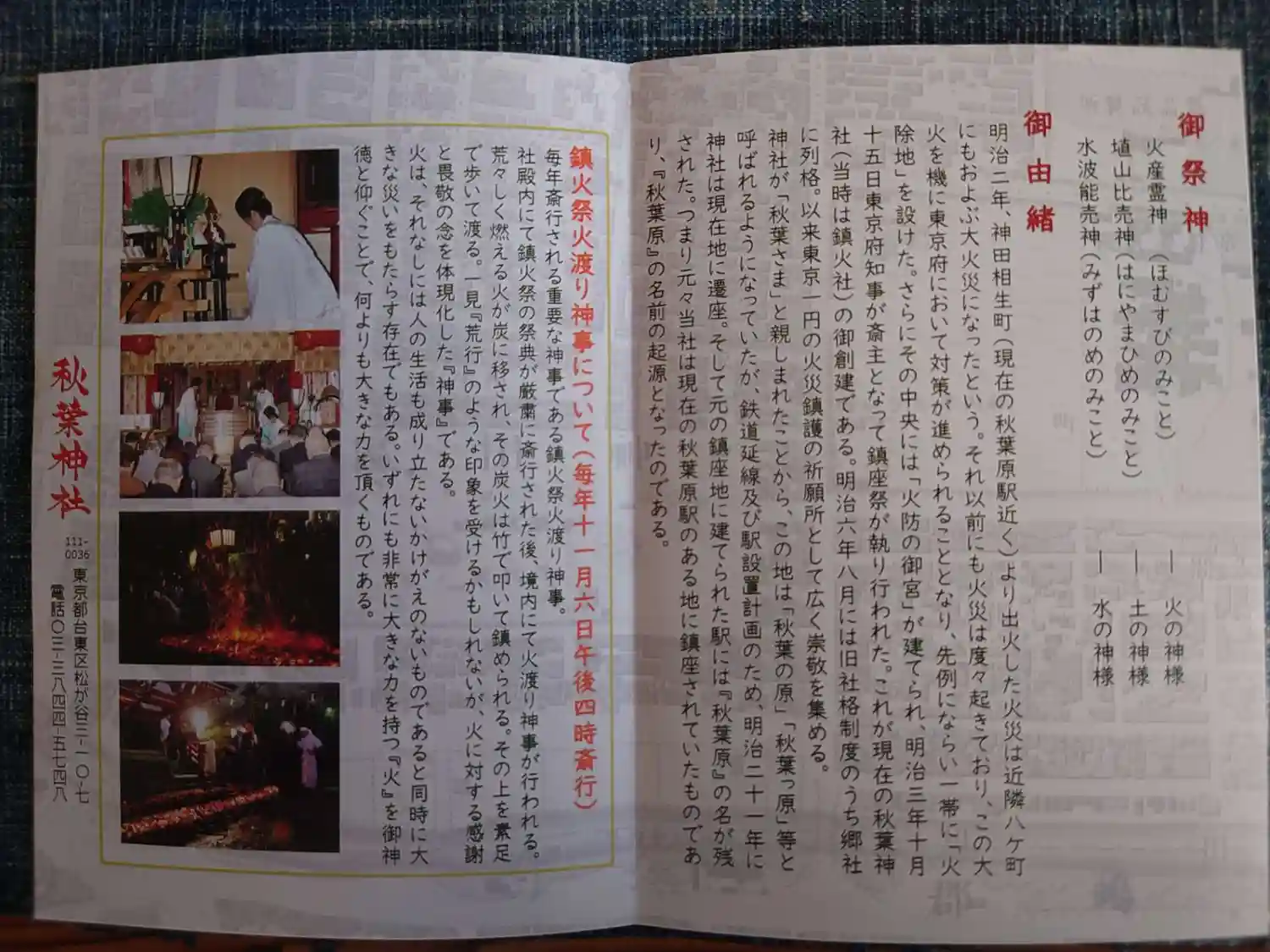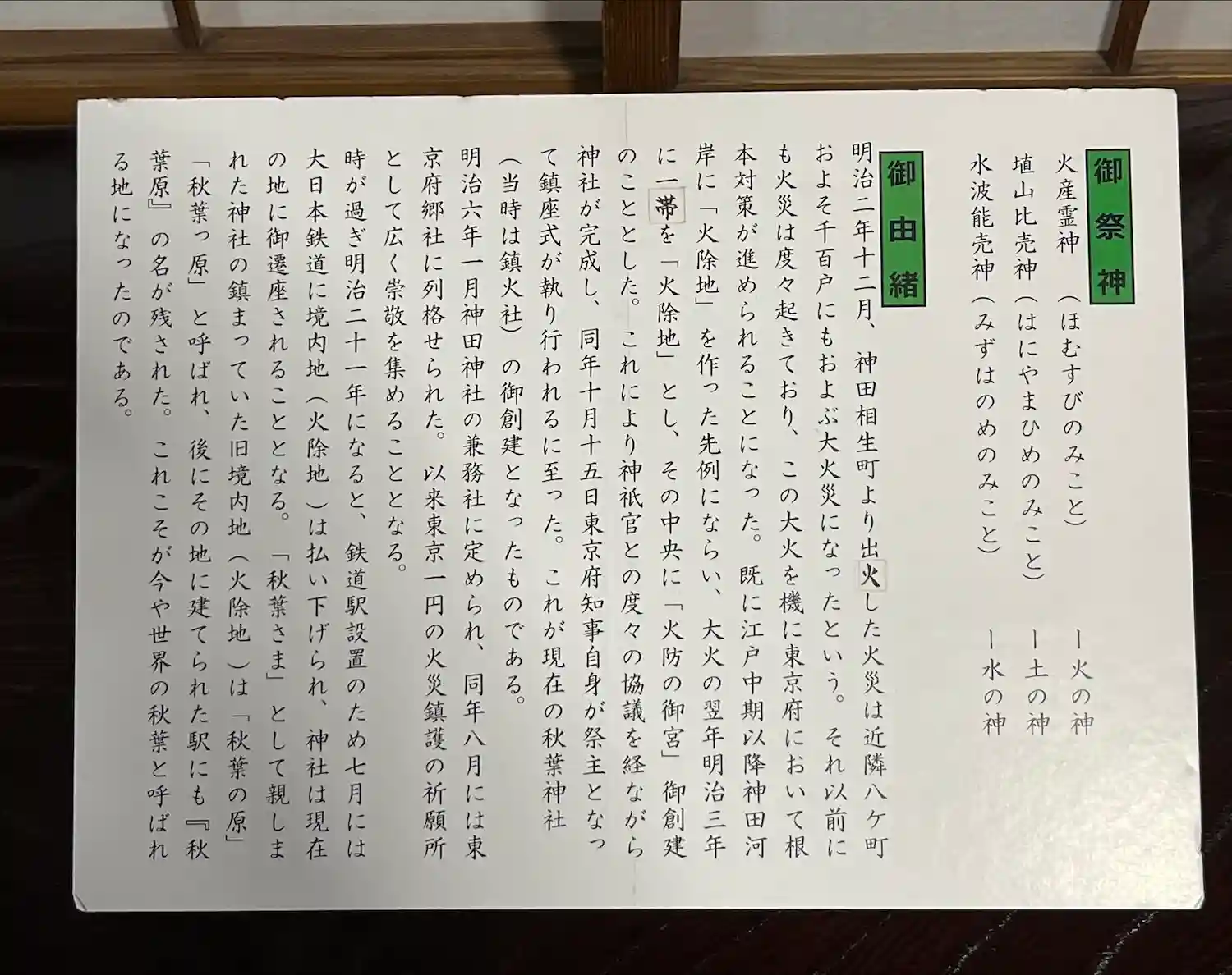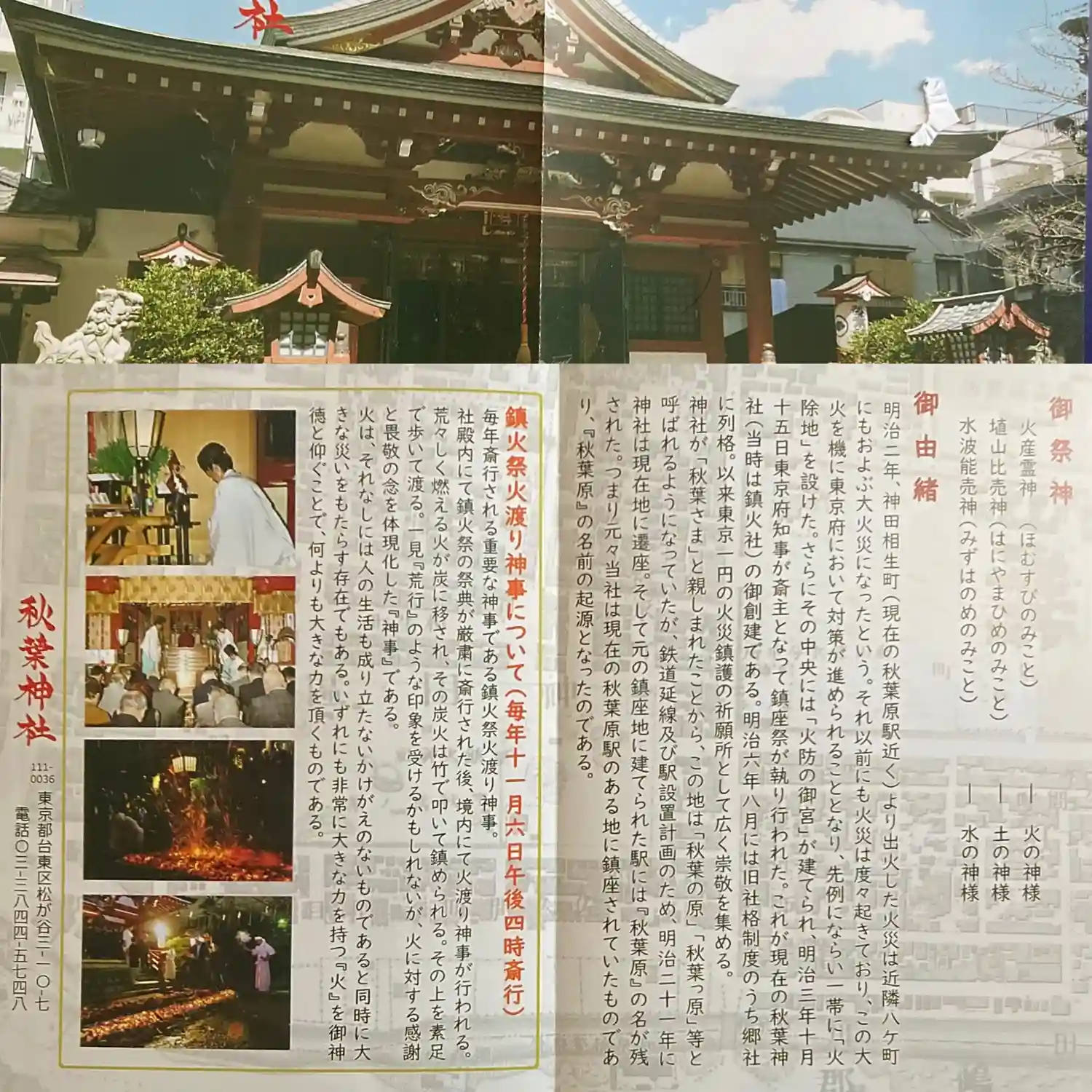 明治時代に東京で火事が頻発して宮城内紅葉山より鎮火三神を奉遷して秋葉原の地に創建したのが始まりです…