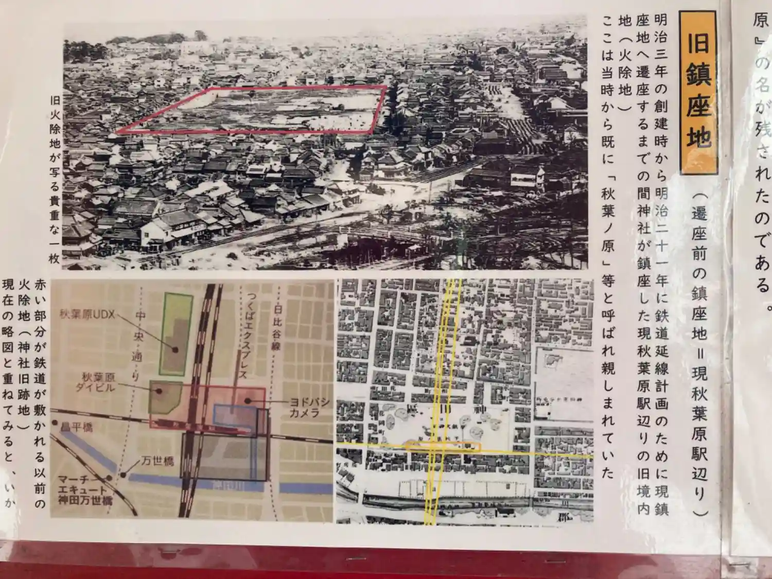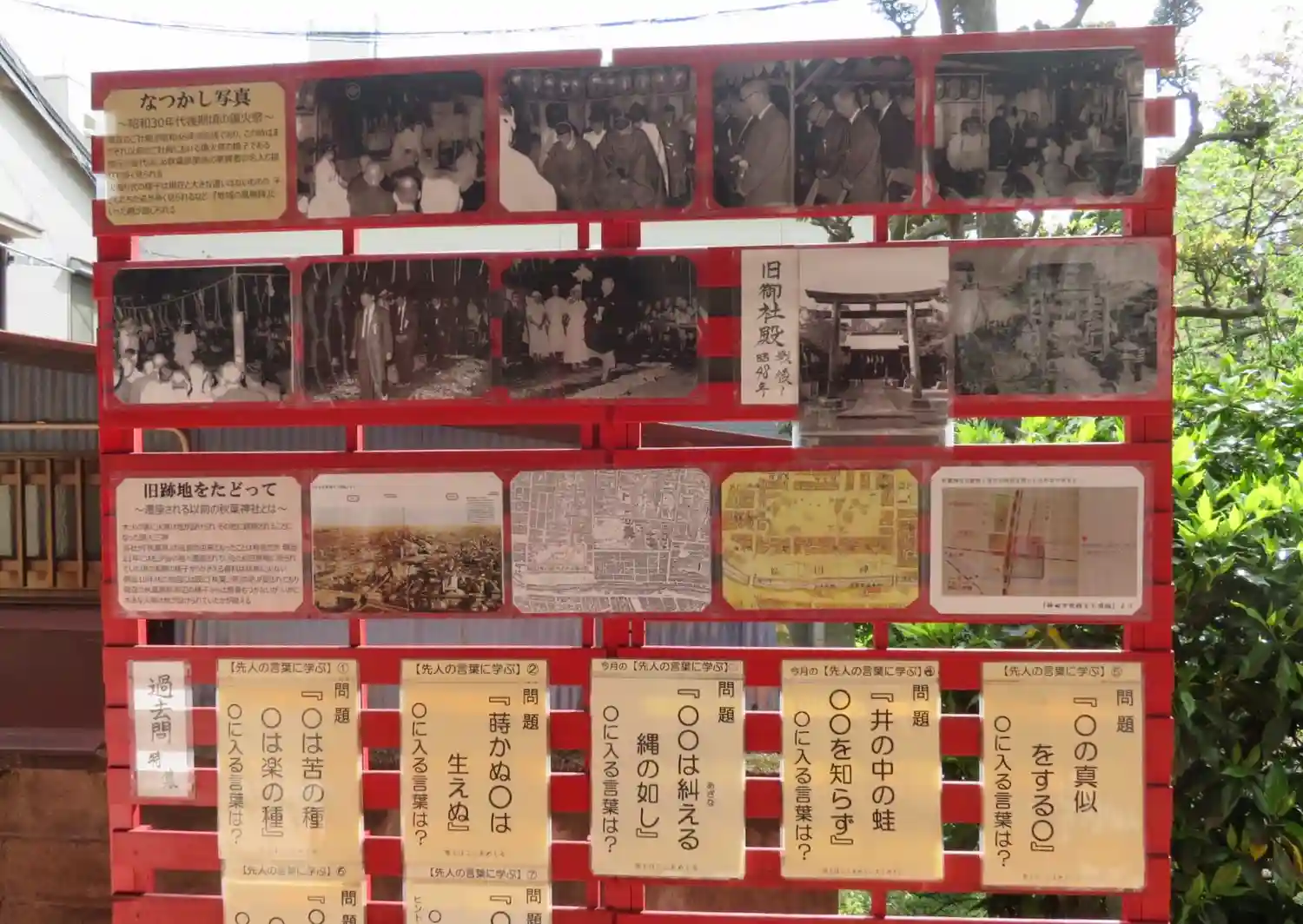 社殿横には、懐かし写真や旧跡地の古地図、クイズが掲示されていました