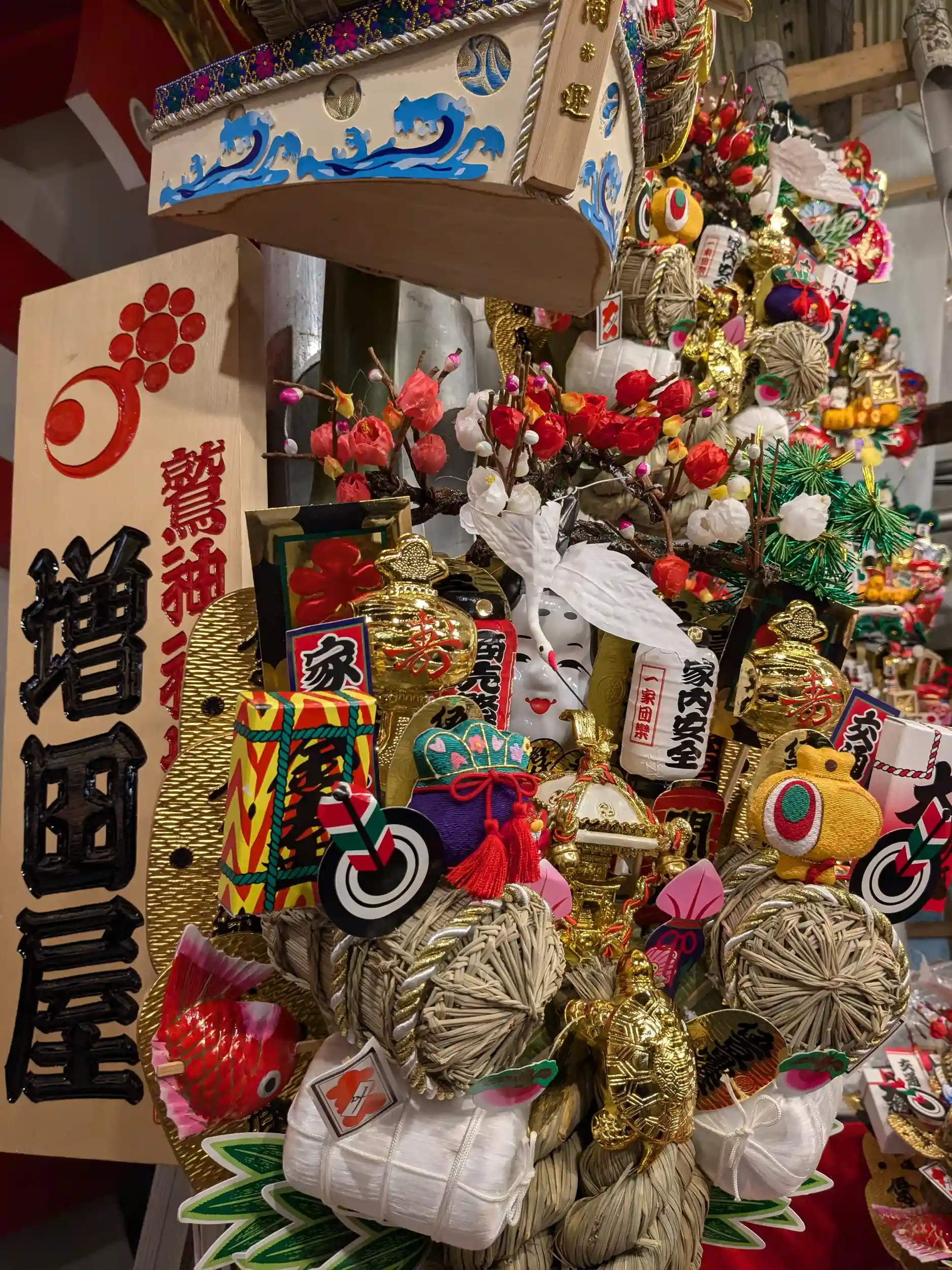 《縁起熊手》開運招福☆商売繁盛〜ズラリと並んで輝く様子は壮観!記念に一つ欲しかったけれど、旅先なので見てパワーをいただくことにしました。家に持ち帰るのはまた次の夢にです。