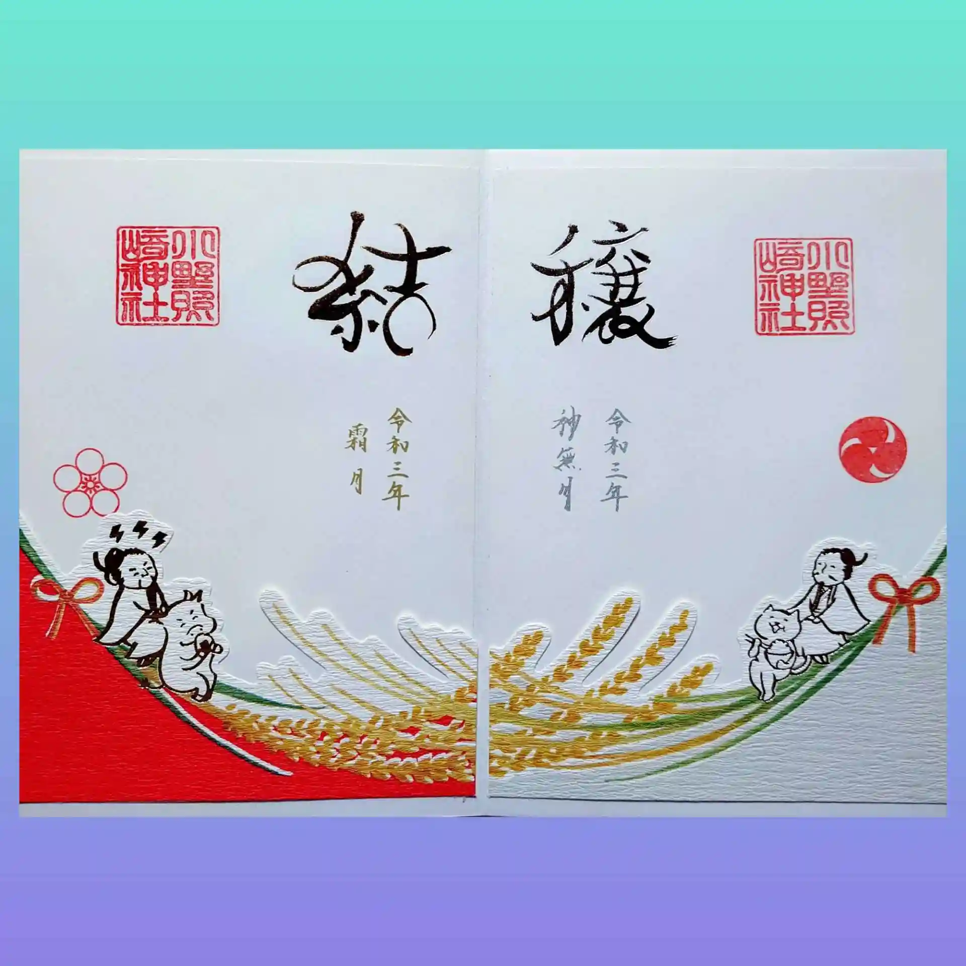 下部部分の紅白幕、稲穂🌾、御祭神と動物たちは”飾り紙"を貼った「かさね」の御朱印となっております。