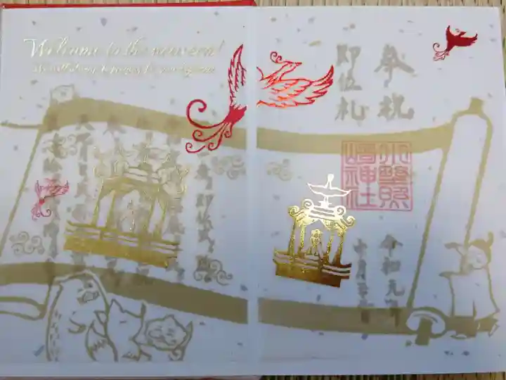 御大礼限定の御朱印。高御座の描かれた巻物を篁公が広げている図。二枚重ねになっています。