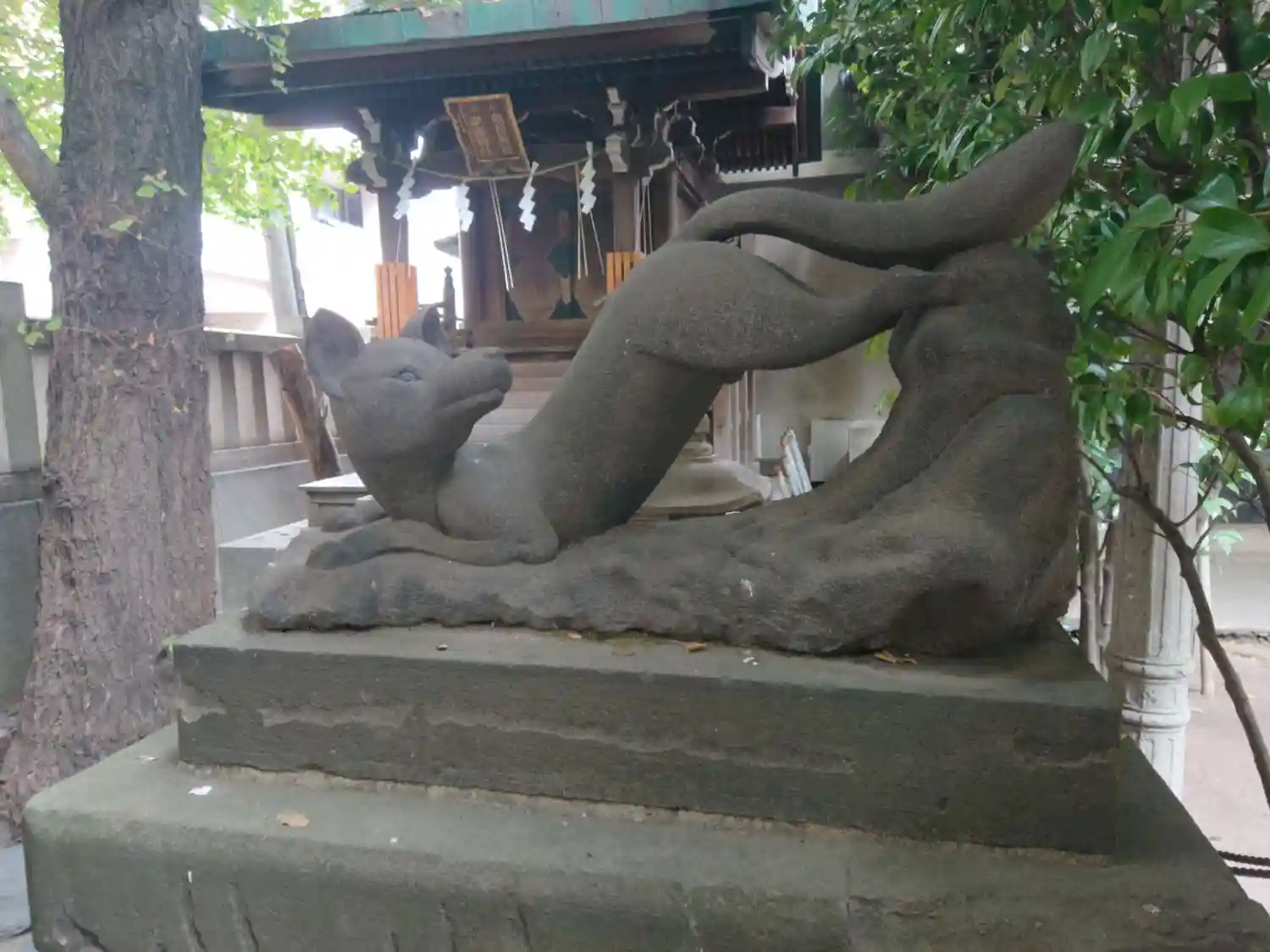 奥にあるお稲荷さん。こちらには金運担当のご眷属がおられるとのことでしたが…。最初にお参りした時は、生きた狛猫さんはおられませんでした。そりゃそうそういないよなー、と思いつつ、御朱印をいただいたり、境内をウロウロしていると…