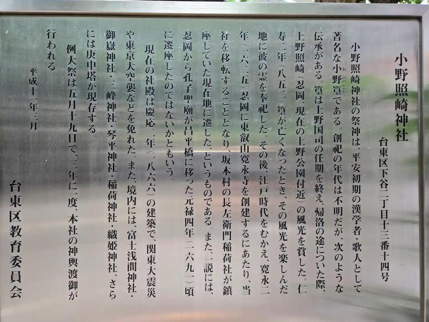 台東区下谷にある村社の神社。創建は仁寿2年(852年)で主祭神は小野篁、菅原道真。例祭は5月19…