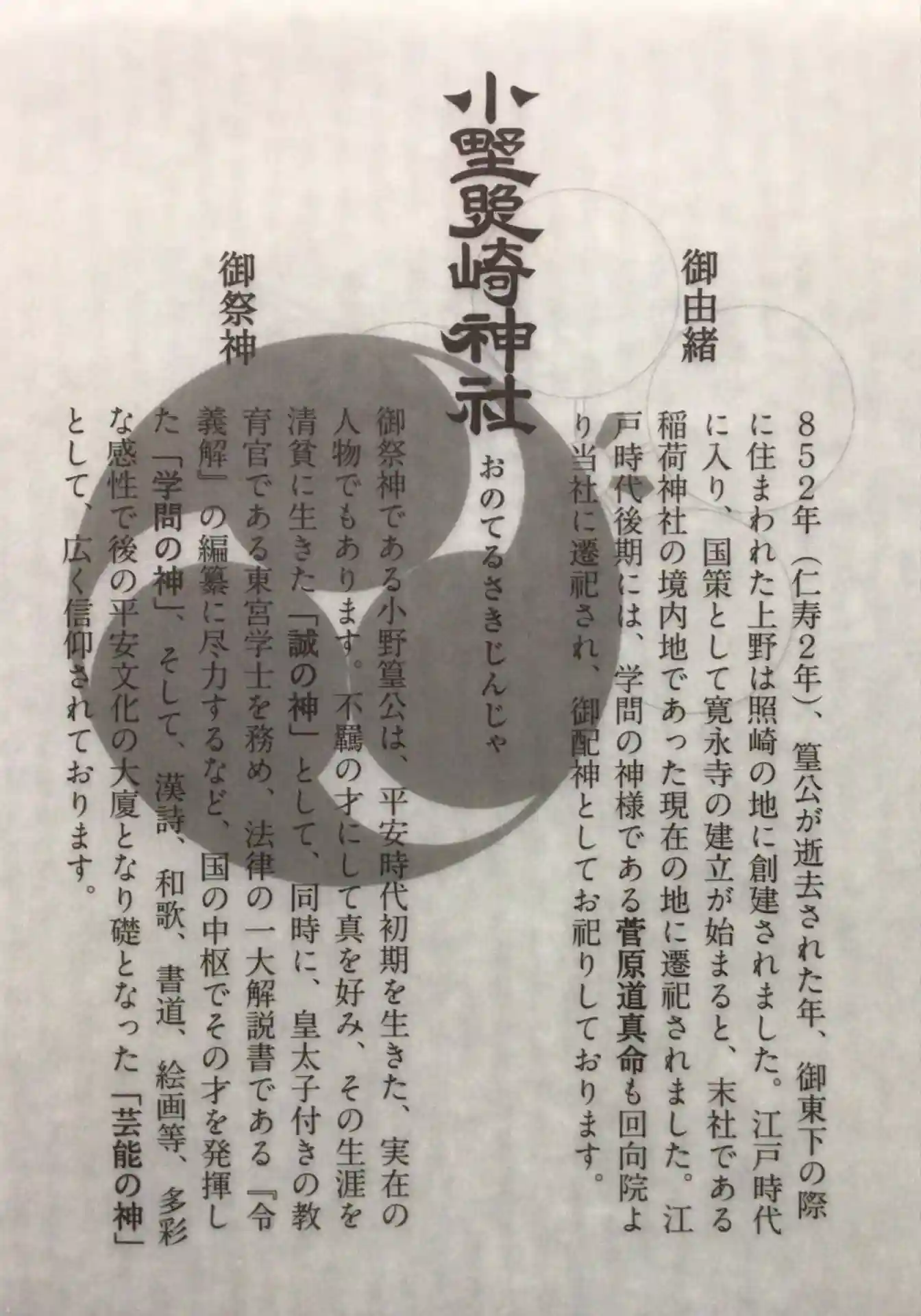 芸能・学問の神様として、小野篁公・菅原道真をお祀りする神社です。