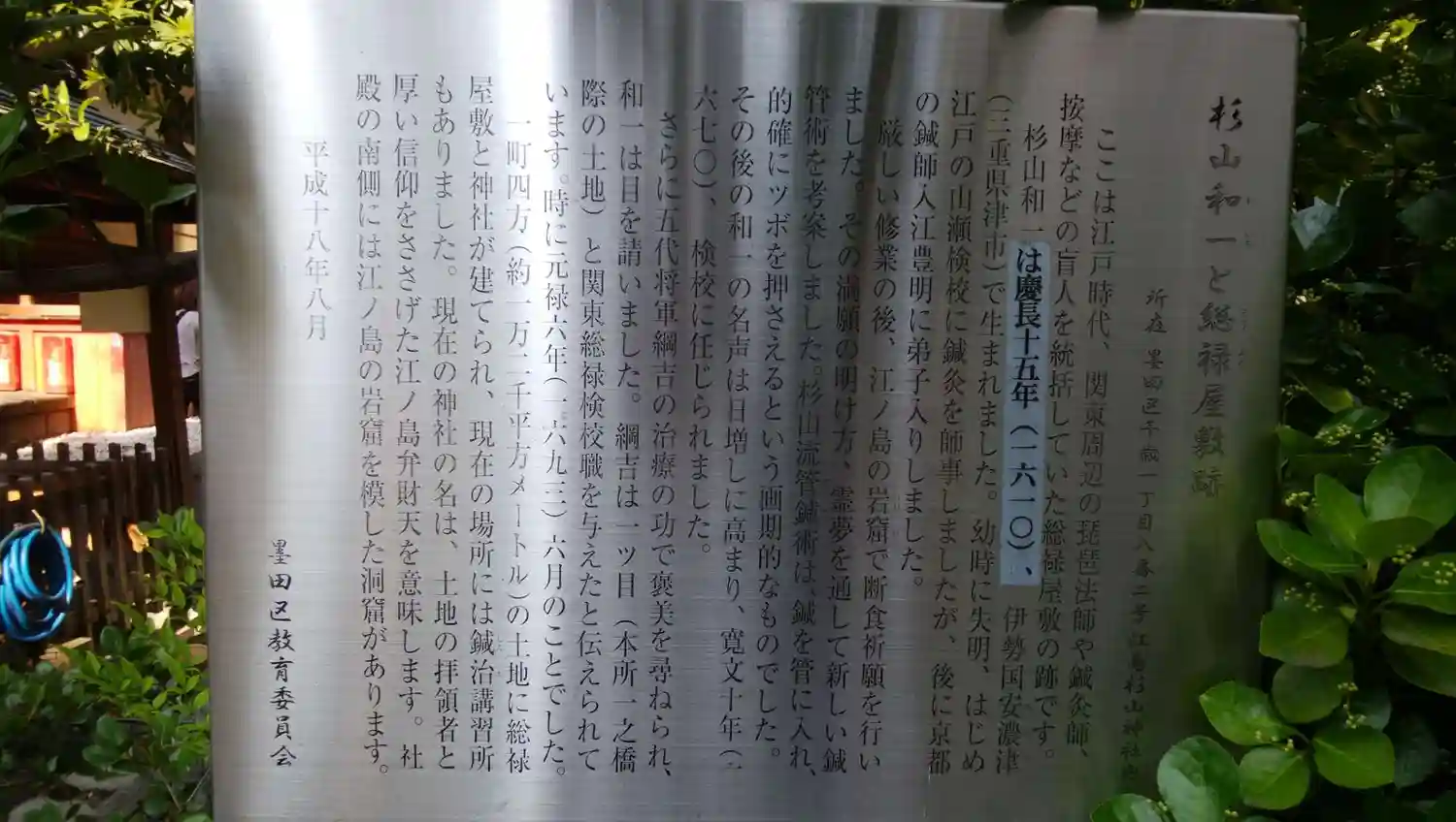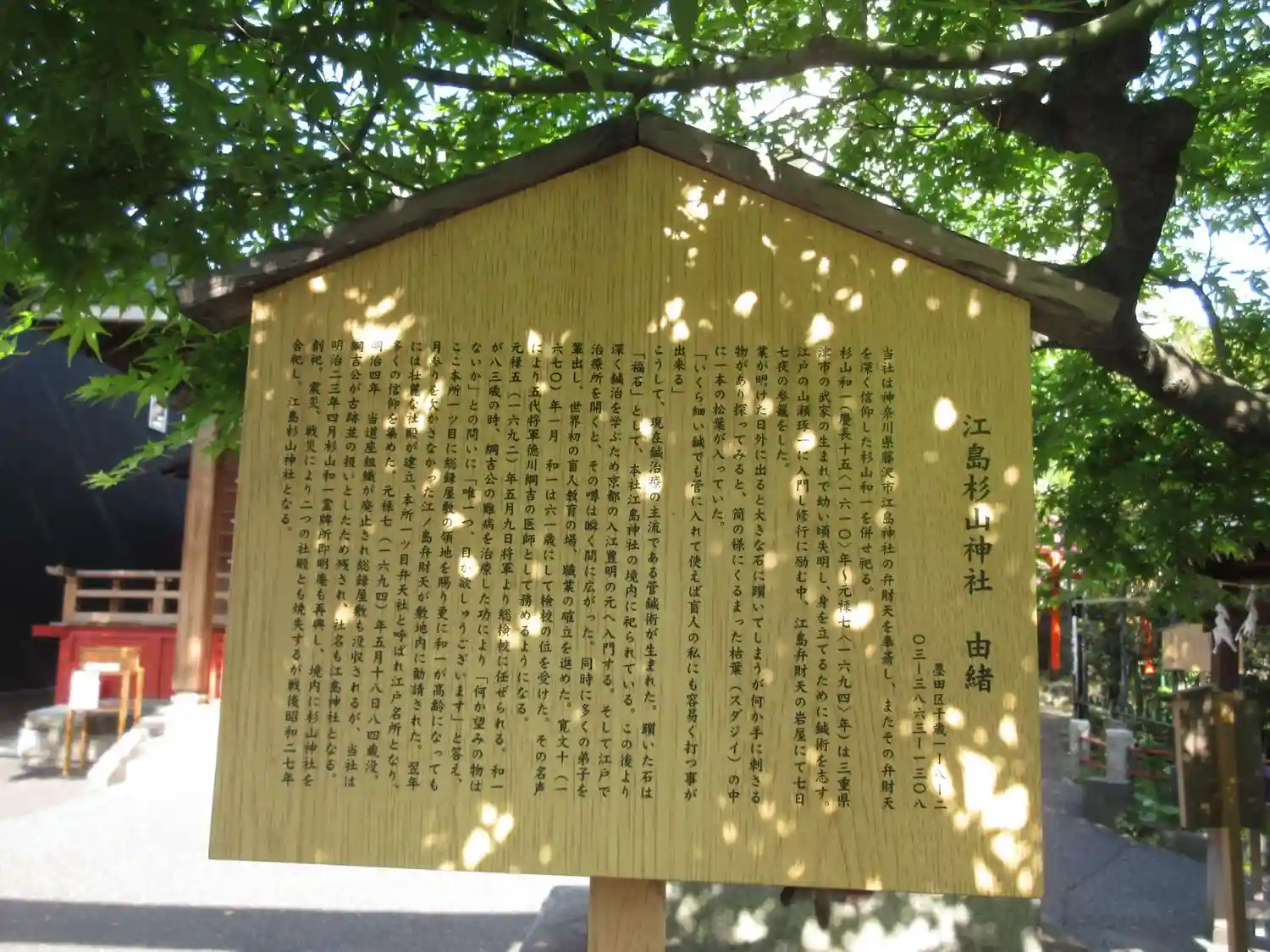 | ご由緒 | 当社は神奈川県藤沢市江島神社の弁財天を奉斎し、またその弁財天を深く信仰した杉山和一を併せ祀る。