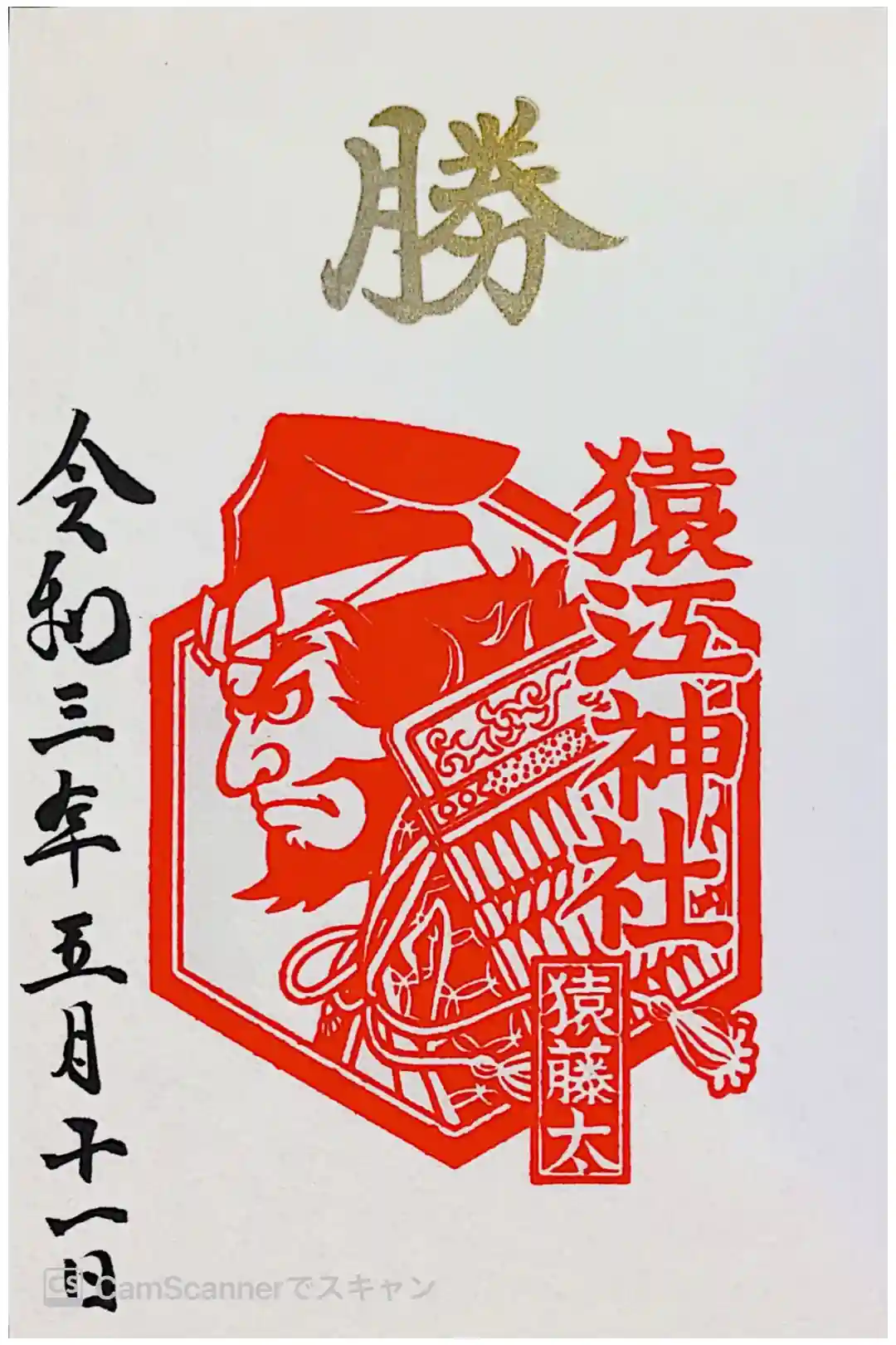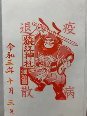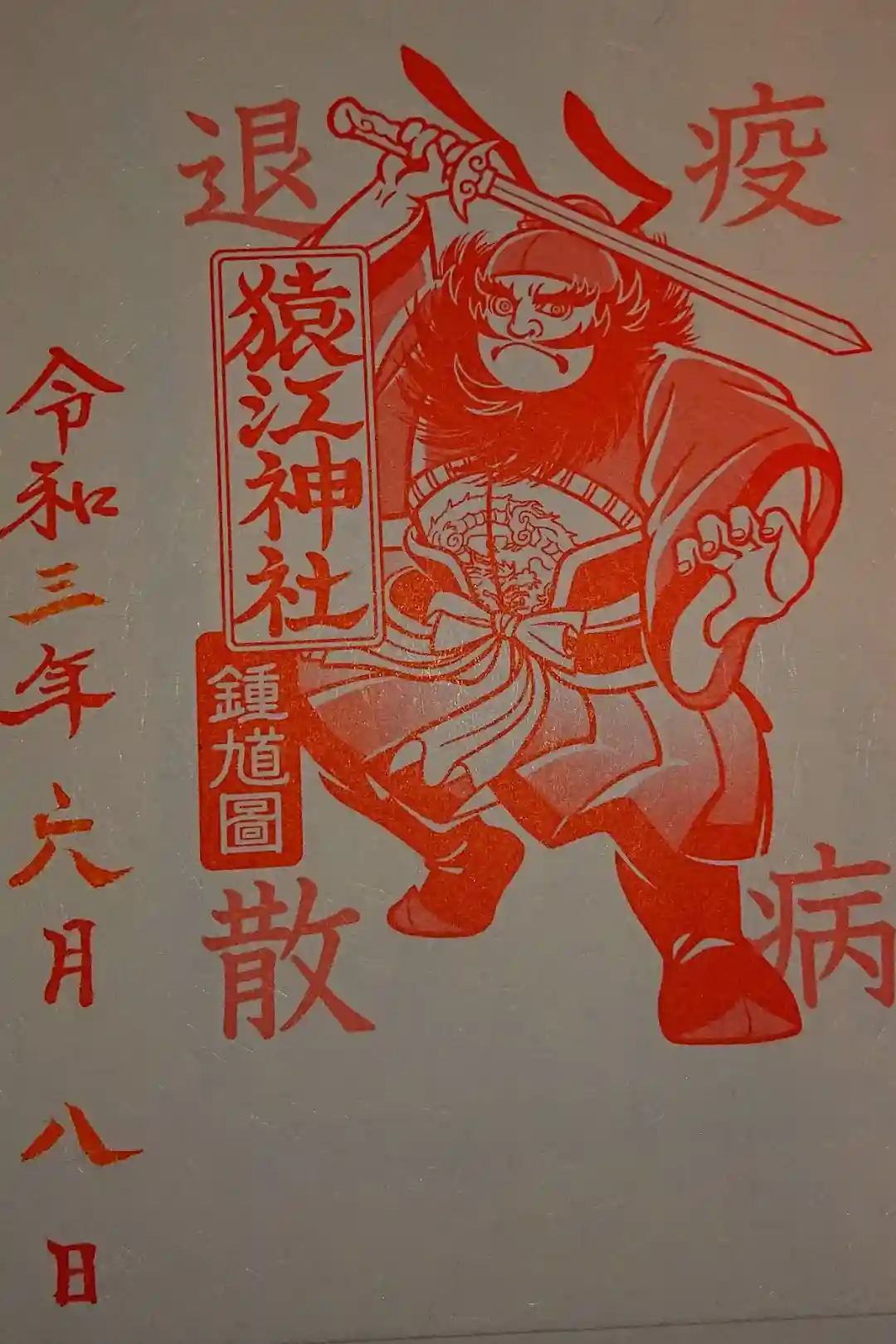 書置きですが疫病退散の御朱印を頂きました。猿藤太の鍾馗画です。