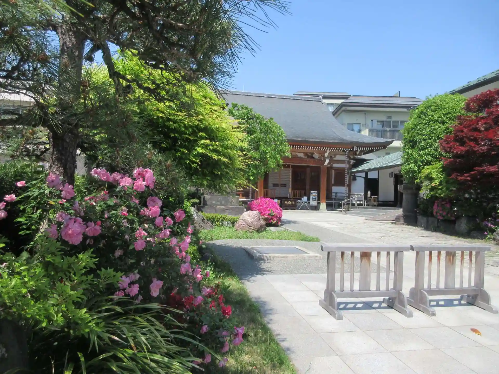 ツツジにバラとピンクの似合う寺です。
