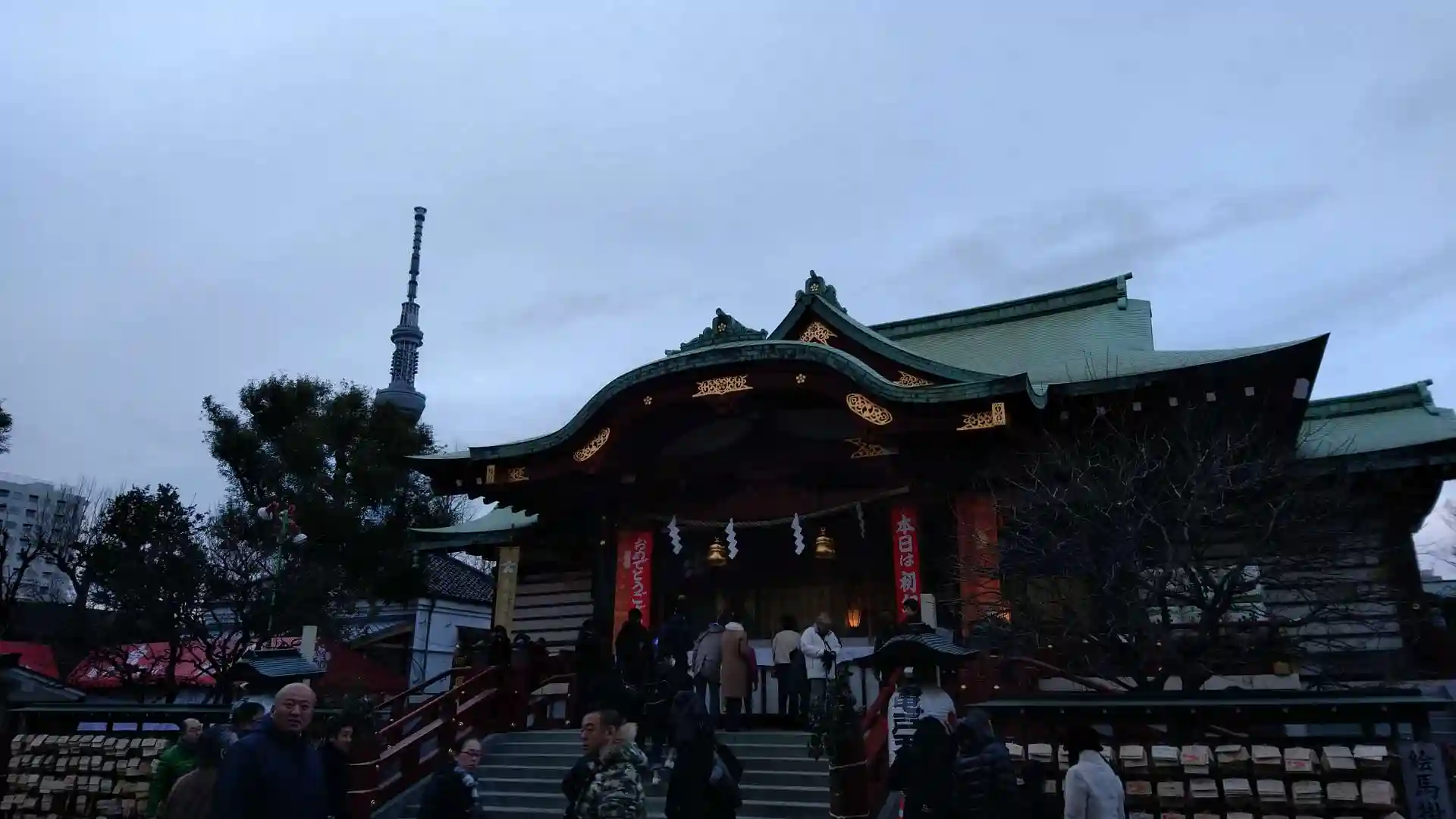 15時頃に仕事を切り上げ、深川不動堂、富岡八幡宮と参拝してから亀戸天神社。境内の駐車場がタイミングが合わず3回満車で、周辺のコインパーキングも当たったけれど空きがなく、最後の最後、境内の駐車場に行ったら敷地内の列に滑り込めました。都心の神社はこの時期、車で行ってはいけませんね。