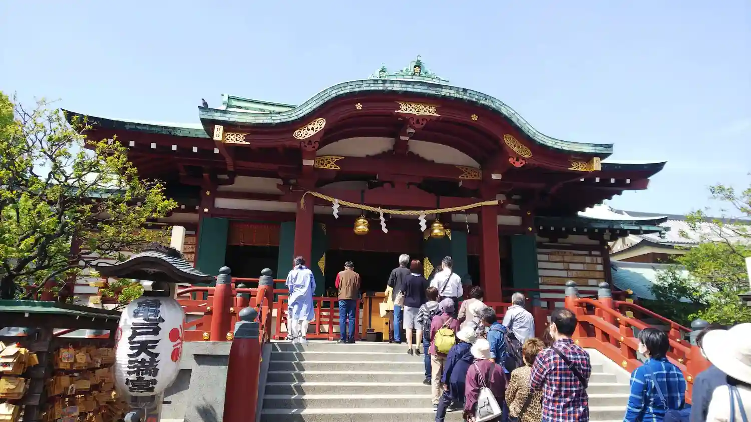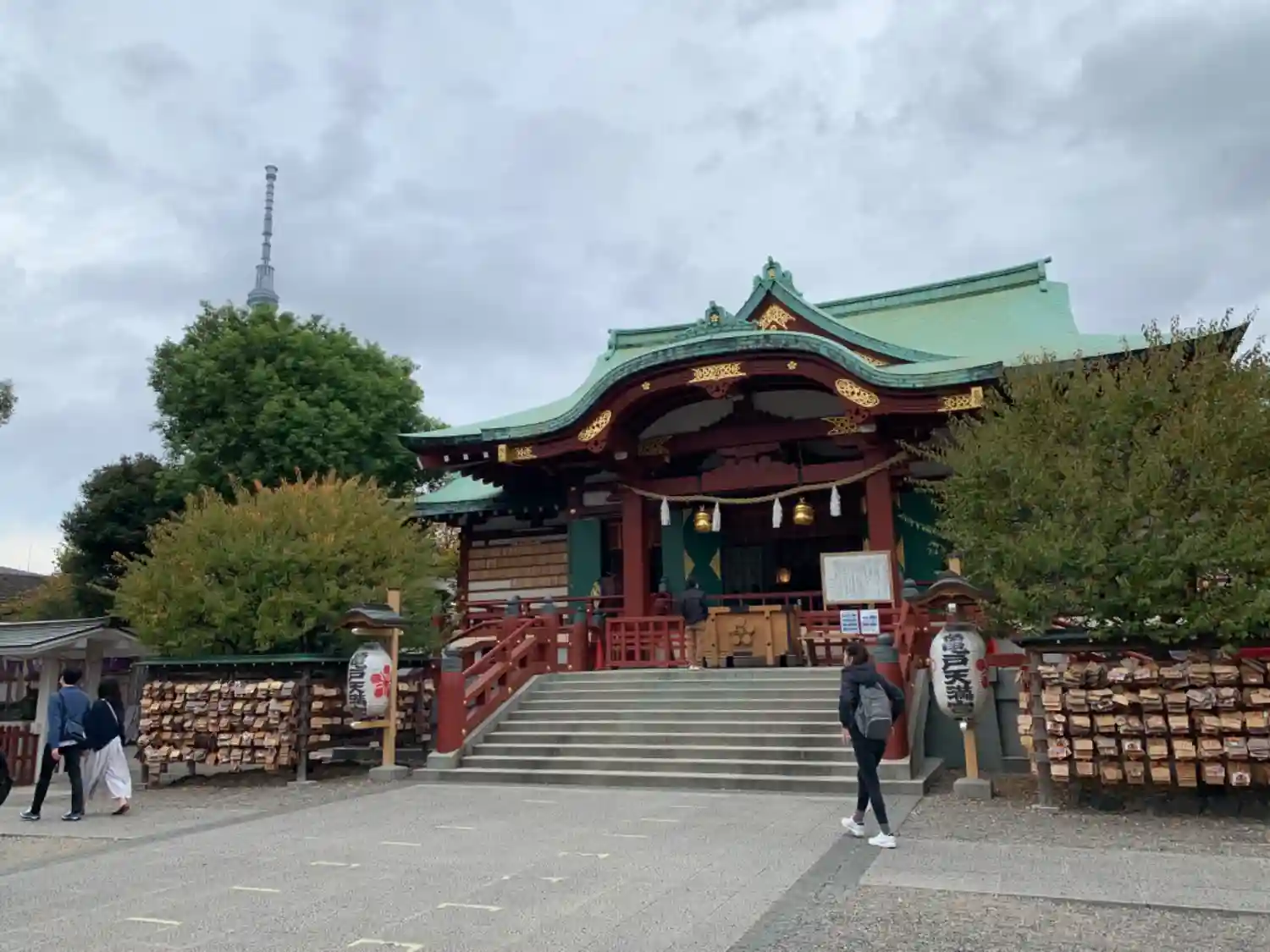 <拝殿>全景。屋根のうす青緑色と躯体の朱色のコントラストがきれい。手前の絵馬掛けには、半端ない数の絵馬が掛かっている。さすが東京屈指の学問の神様。