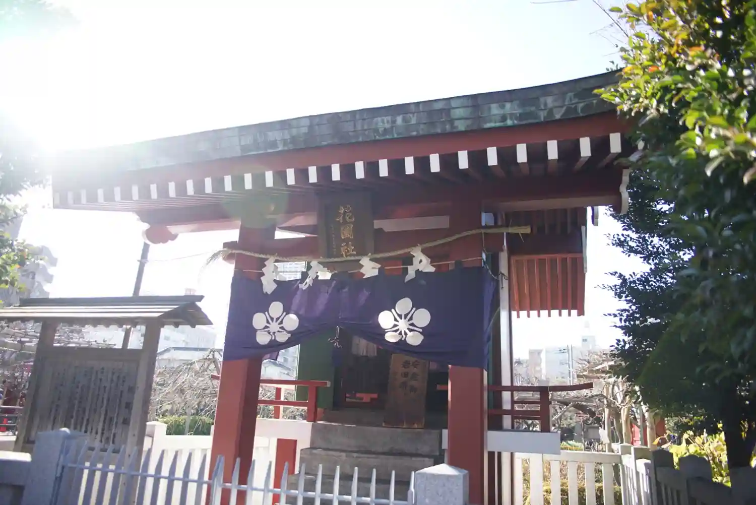このお社は、菅公(菅原道真公)の奥様で、宣来子(のぶきこ)の方と14方のお子様がお祀りされています。宣来子の方は、菅公と同門の学者島田忠巨の娘で、幼少の頃から親しみ、生涯苦楽を共にするところでしたが、菅公左遷の折に、妻子とも全国各地に別々に流された苦難の道を歩まれました。悲しみの中にも、妻として、母親としての想いに変わりなく、その背景から心字池の畔(ほとり)に建立され、5月の第2日曜日に花園社祭を執り行い、母の日にちなんで赤い花をお供えし、御霊をお慰めしています。