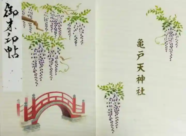 白色の地に、上部に藤の花、下部に太鼓橋が描かれ、左上に御朱印帖の文字、裏面は右上と左上に藤の花、真ん中に亀戸天神社の文字が入っています。