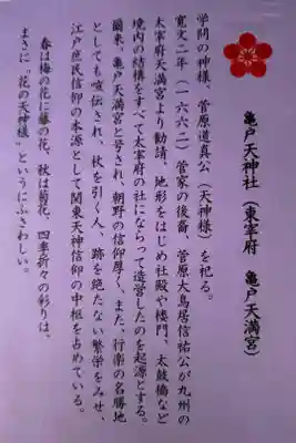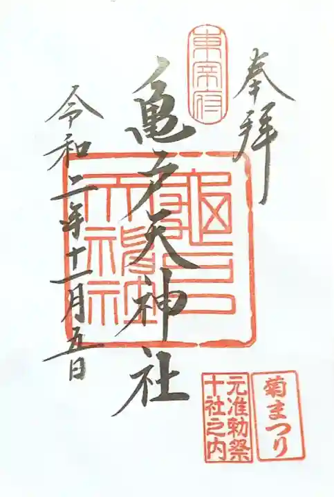 真ん中に亀戸天神社と書かれ、右上に東宰府、真ん中に亀戸天神社の印、右下に元准勅祭十社之内の印、菊まつりの印が押されています。