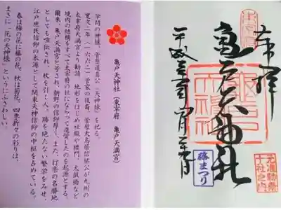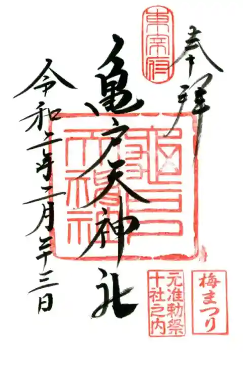 真ん中に亀戸天神社と書かれ、右上に東宰府、真ん中に亀戸天神社の印、右下に元准勅祭十社之内の印、梅まつりの印が押されています。
