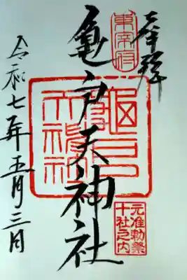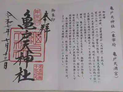 真ん中に亀戸天神社と書かれ、右上に東宰府、真ん中に亀戸天神社の印、右下に元准勅祭十社之内の印が押されています。