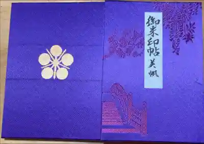 鮮やかな紫色の地に、表面は右上に藤の花、左上に梅の花、左下に太鼓橋が描かれ、真ん中に御朱印帖の文字、裏面は真ん中に「変わり剣梅鉢」の神紋が入っています。