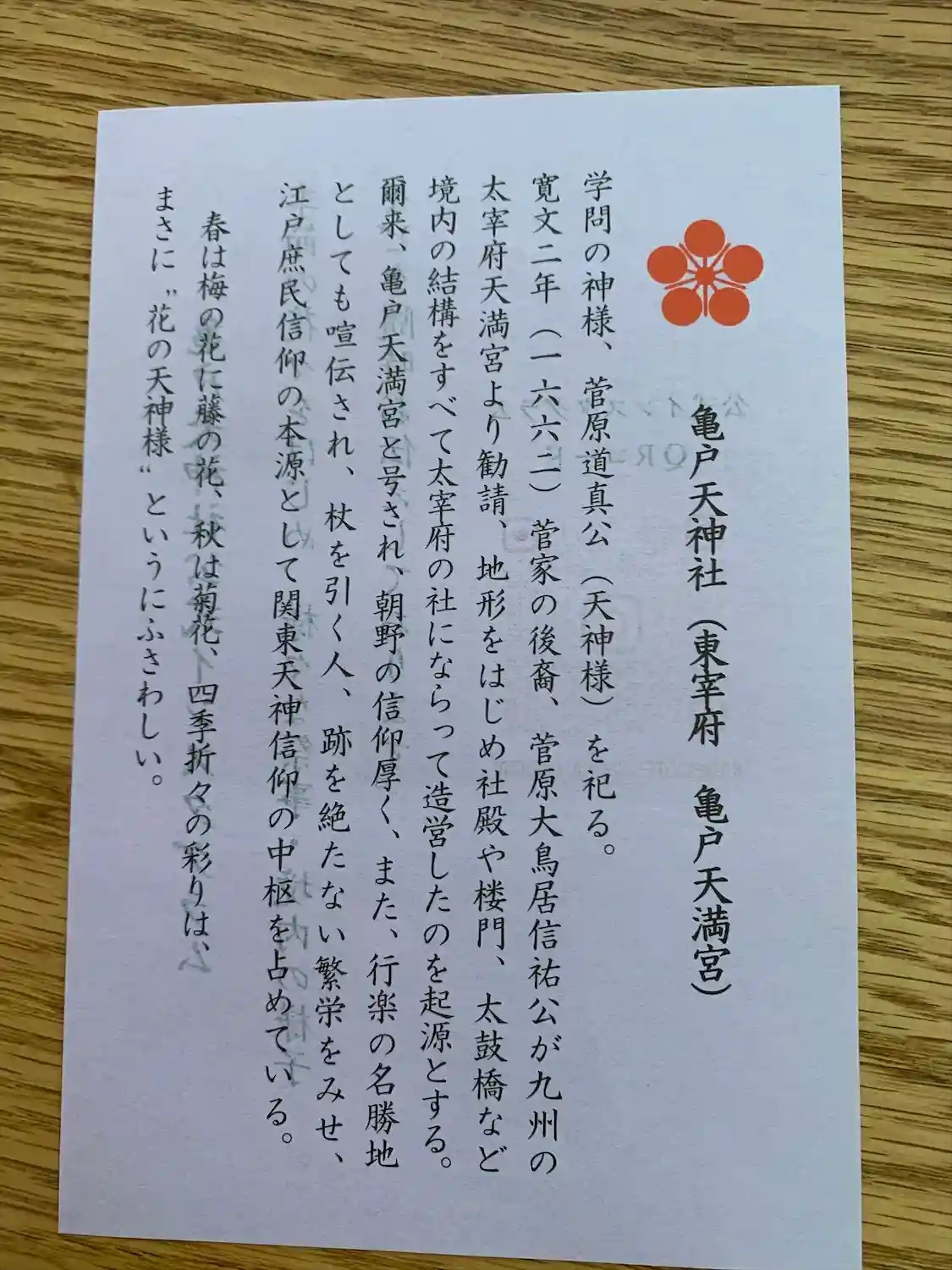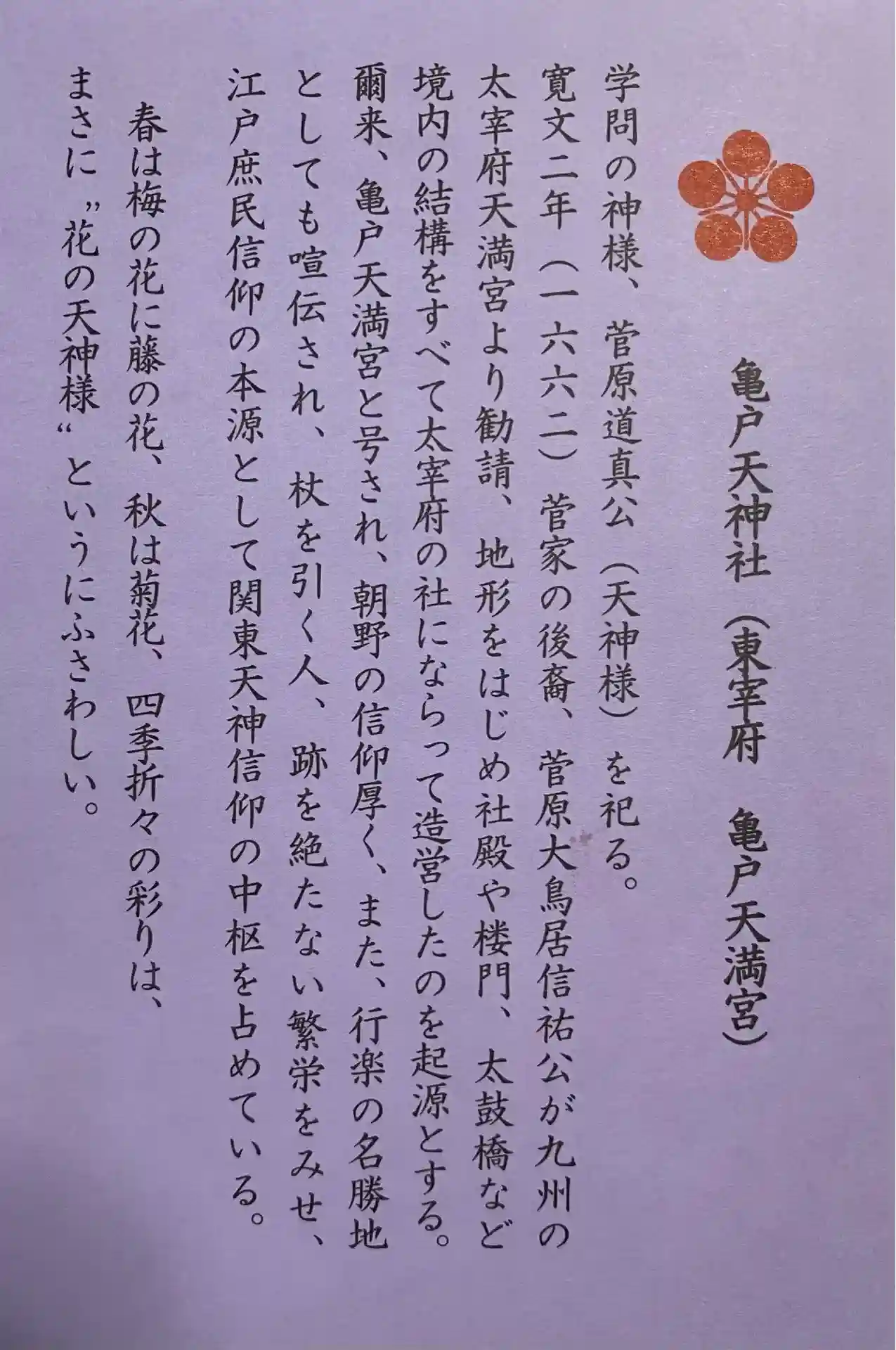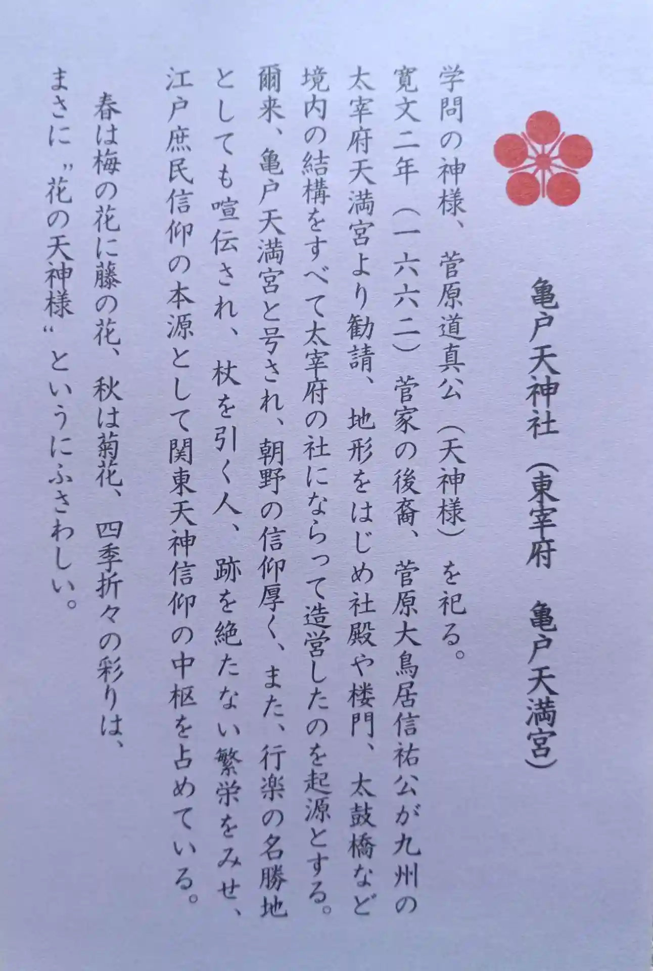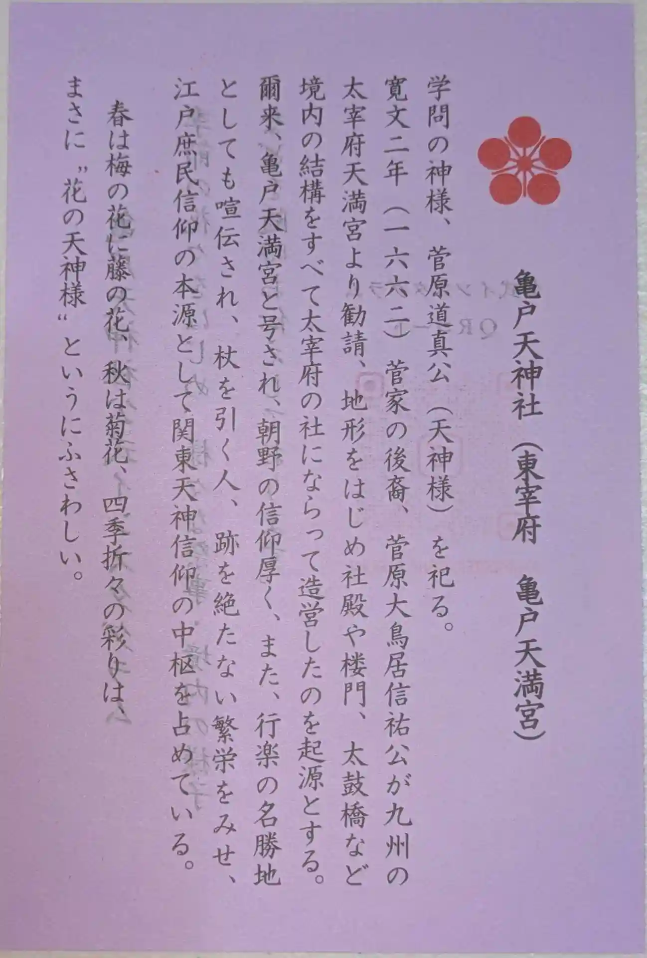 関東三大天神、東京十社、東都七天神 等の札所になっています。