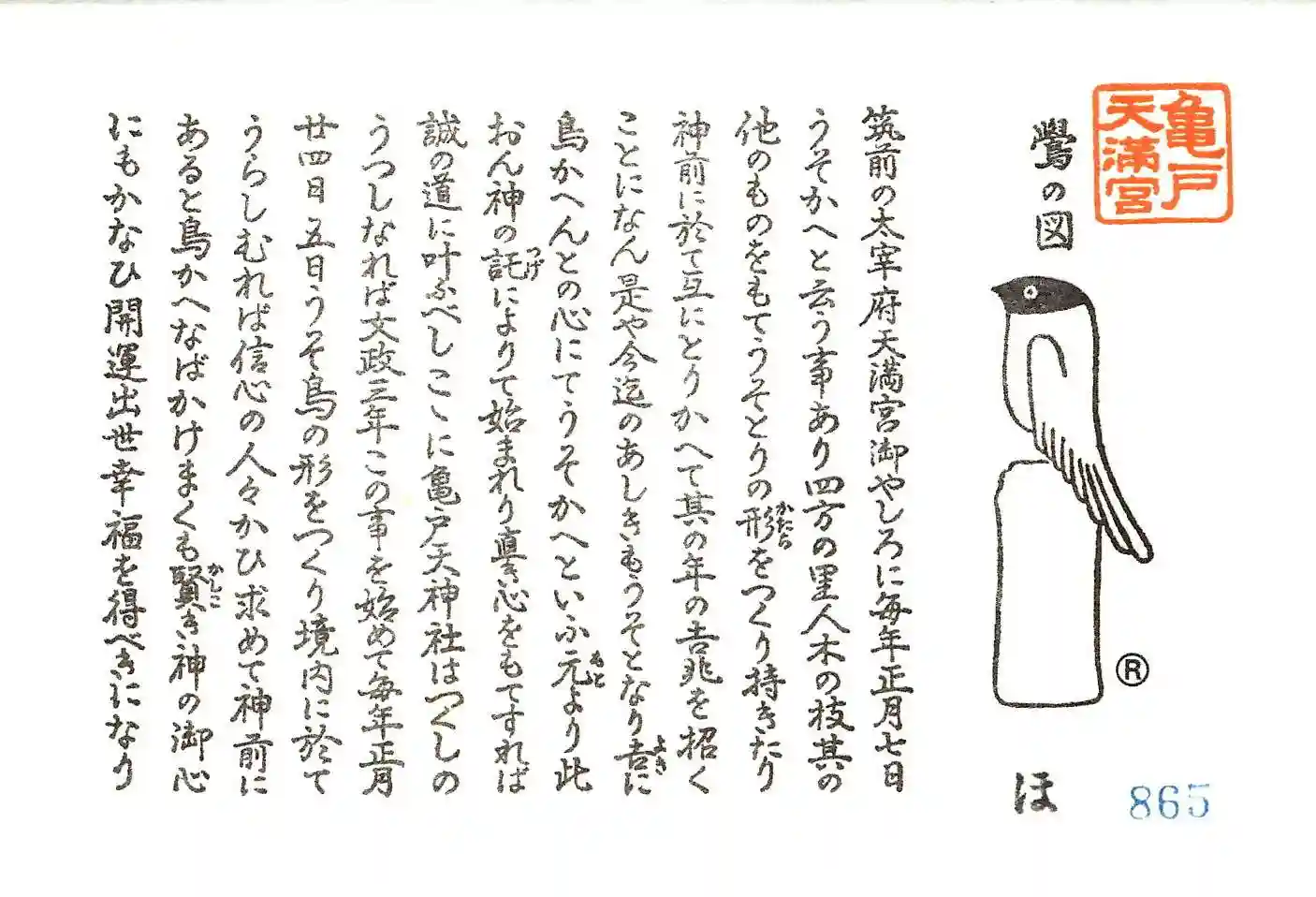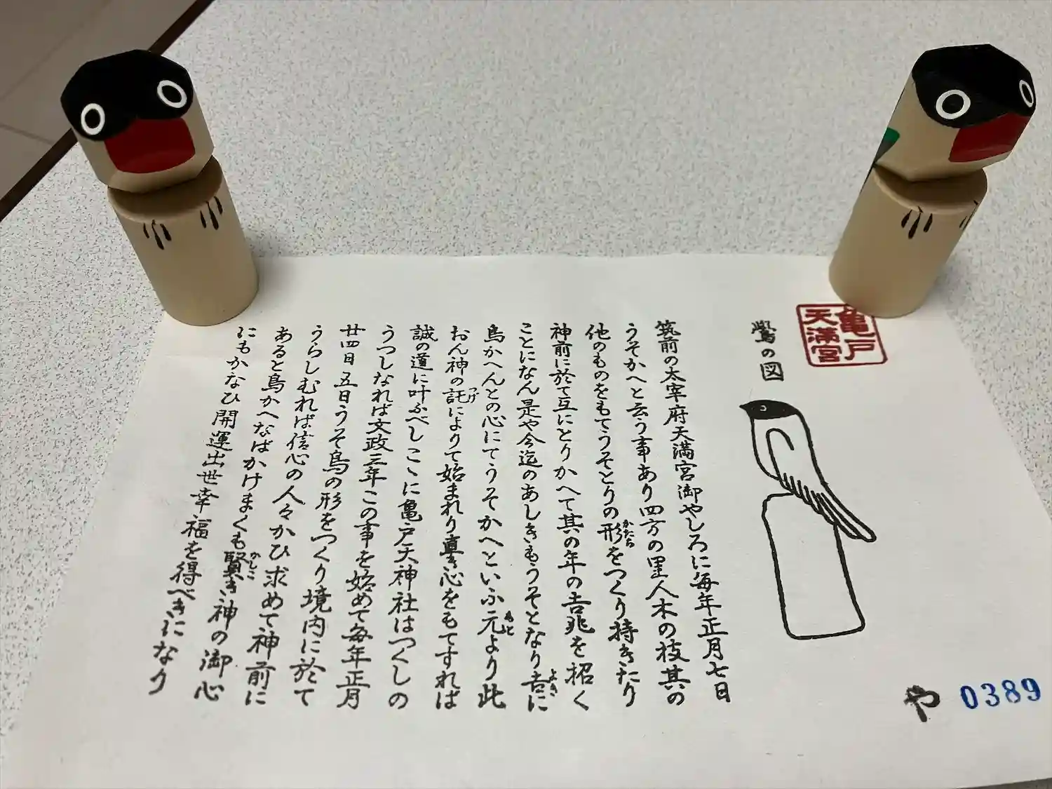 幸運を招く鷽(うそ)。1月24、25日には「うそ替え神事」が行われます。太宰府天満宮でもおこなわれる神事で、前年の厄才を嘘とする意味が込められています。