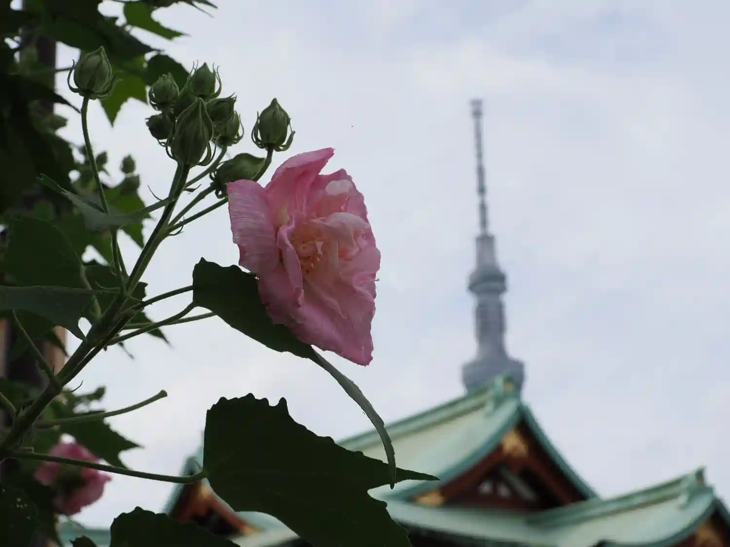 本堂とスカイツリーと曇り空