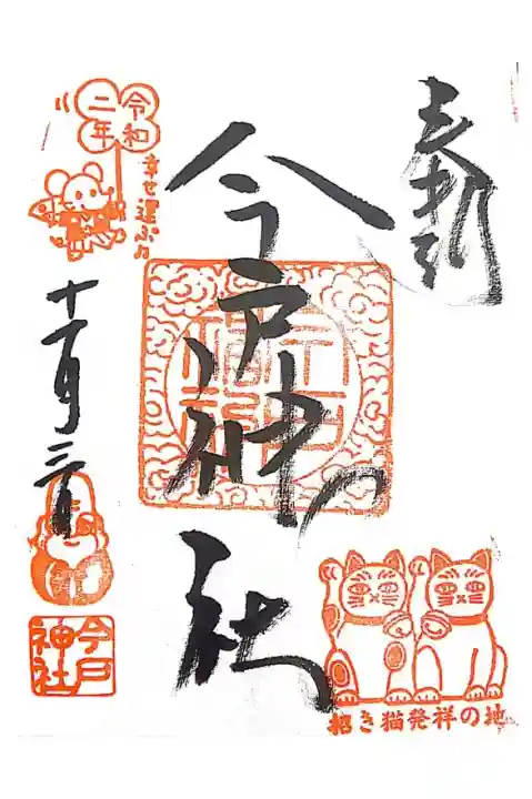 真ん中に今戸神社と書かれ、今戸神社の印、右下に招き猫発祥の地の印、左上に令和二年の印、左下に福禄寿のイラストの印と今戸神社の印が押されています。