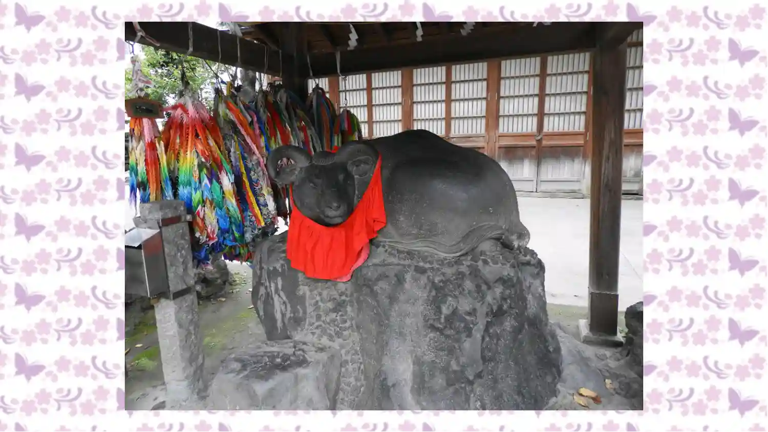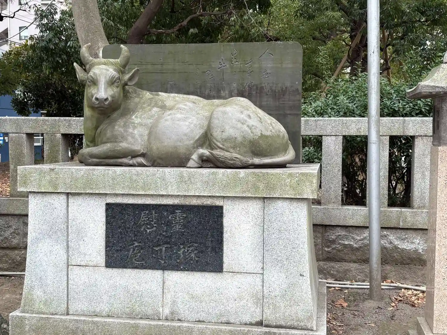境内には「撫牛」と呼ばれる牛の像があり、自分の体の悪い所と同じ部分を撫でると病気が治ると言い伝えられている。