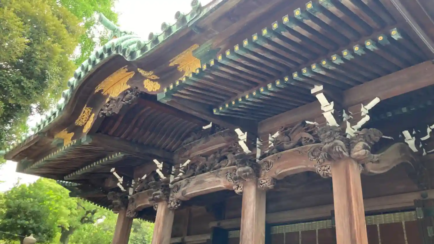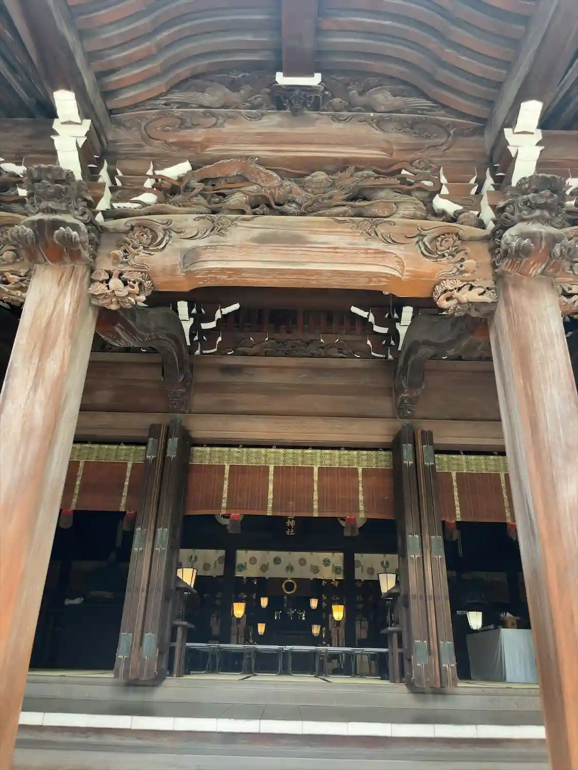 社殿の彫り物がとても綺麗でした。社殿前の三輪鳥居は建て替えてすぐだったようで、木材が新しかったです。