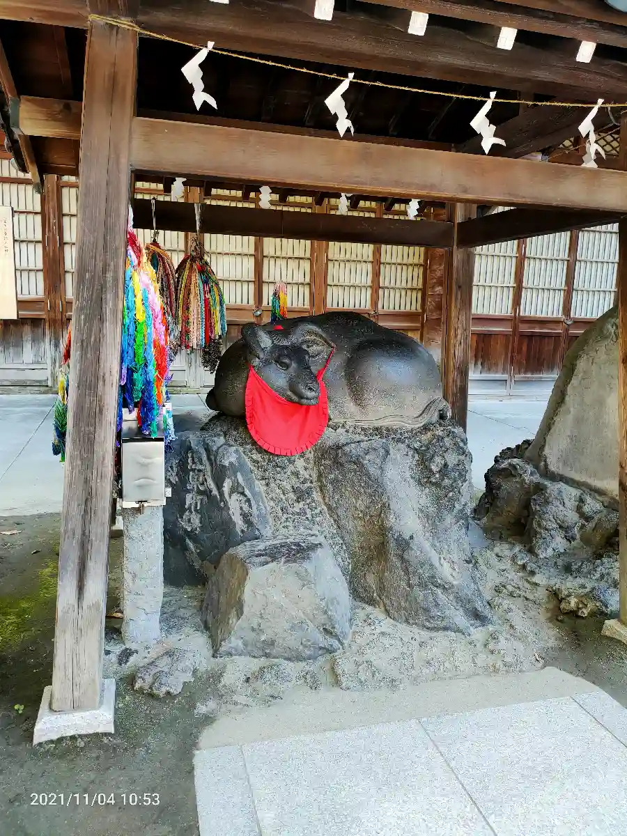 境内の「撫牛」は自分の悪い部分と牛の同じ部分を撫でると病が治るという牛さんです。