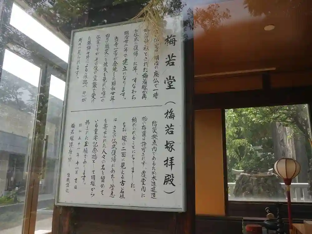 境内で、ガラスの覆堂に納められて保存されている梅若堂は、第2次大戦末期の米軍の空襲でも焼けずに残りました。爆弾の破片などによる傷痕を肉眼で見ることができます。かつて戦争があったことを今に伝える貴重な建築物です。