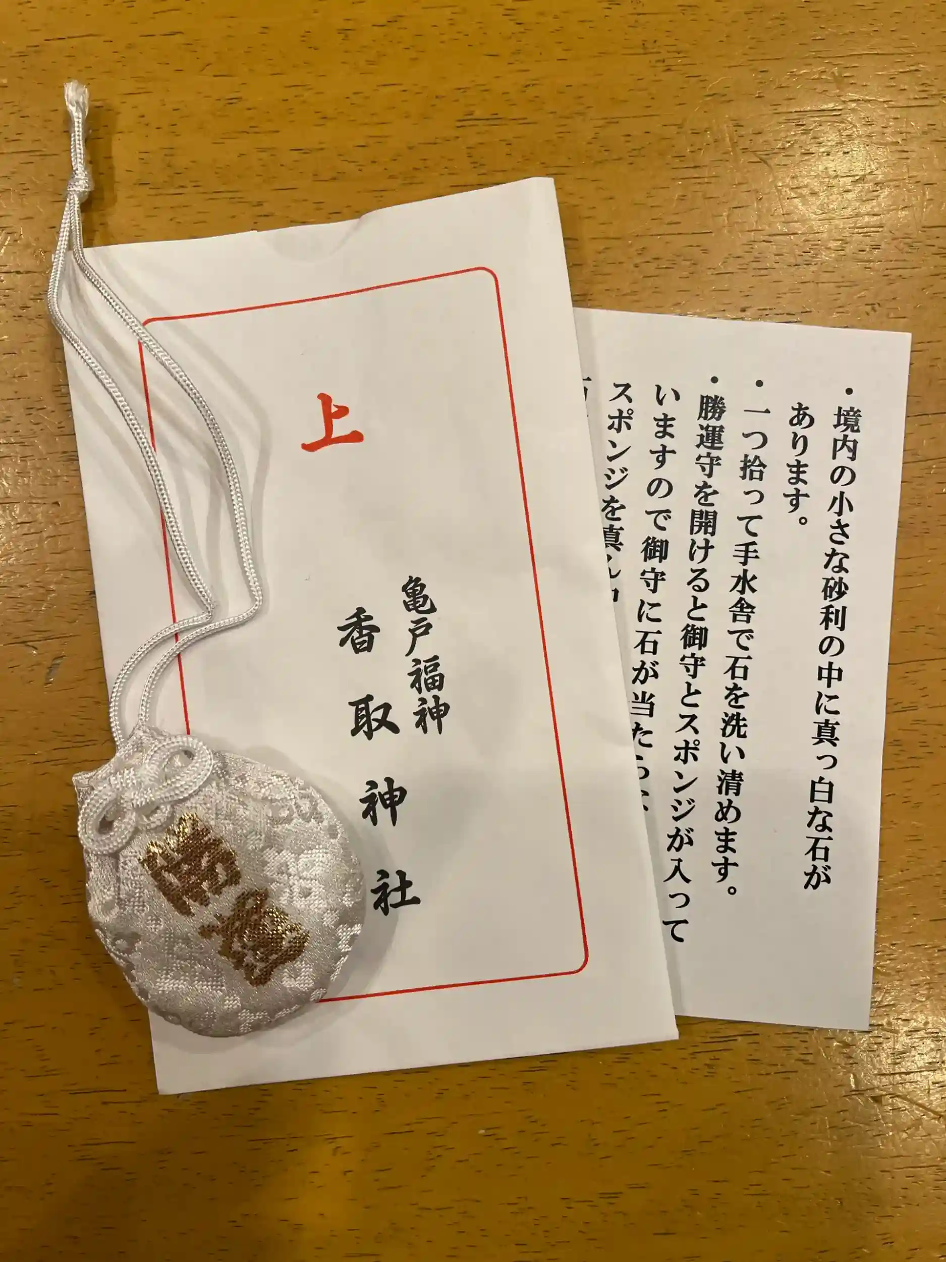 1月限定の御朱印をいただき、勝運守を購入しました。境内の砂利の中にある真っ白な石を拾って勝運守の中に入れるお守りです。