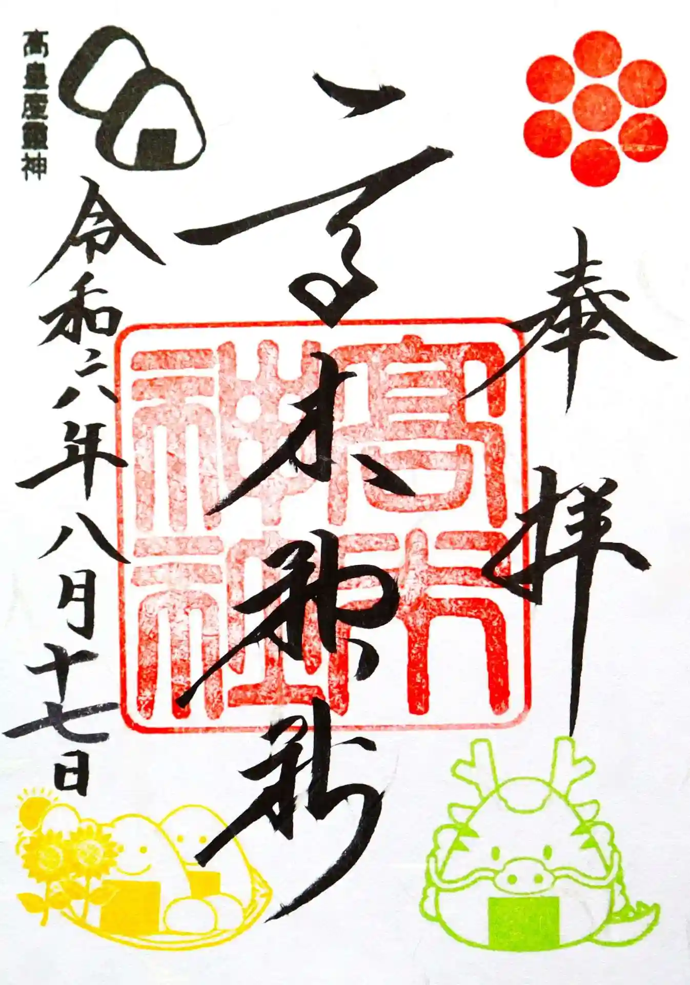 すみだ水族館とコニカミノルタプラネタリウム天空 In 東京スカイツリータウンへ行った際に墨田区押上にある高木神社をお詣りしました。 ご祭神は、日本神話において天地創造の際に最初に現れた三神のうちの一柱、高天原の創造神・高皇産靈神(たかみむすびのかみ)です。 天孫降臨の際には高木神(たかぎのかみ)という名でも登場する為、高木神社の名はこの高木神より付けられたものだと思われます。 創建は応仁2年(1468年)、元々は旧寺島新田(現在の墨田区北部)の鎮守として第六天魔王を祀る「第六天社」と呼ばれていたものの、明治の神仏分離令によって、祭神を高皇産霊神に変更し社名も改めたそうです。 高皇産靈神の「産靈(むすひ)」は、天地・万物を生成・発展・完成させる霊的な働きのことを意味し、男女の「むすび」を象徴する神とも考えられ、縁結びのご利益もあるようです。 結び=おむすび、の駄洒落からか境内の至る所におむすびを模した願い石が供えられていて、御朱印にもおむすびのスタンプが押されていました。