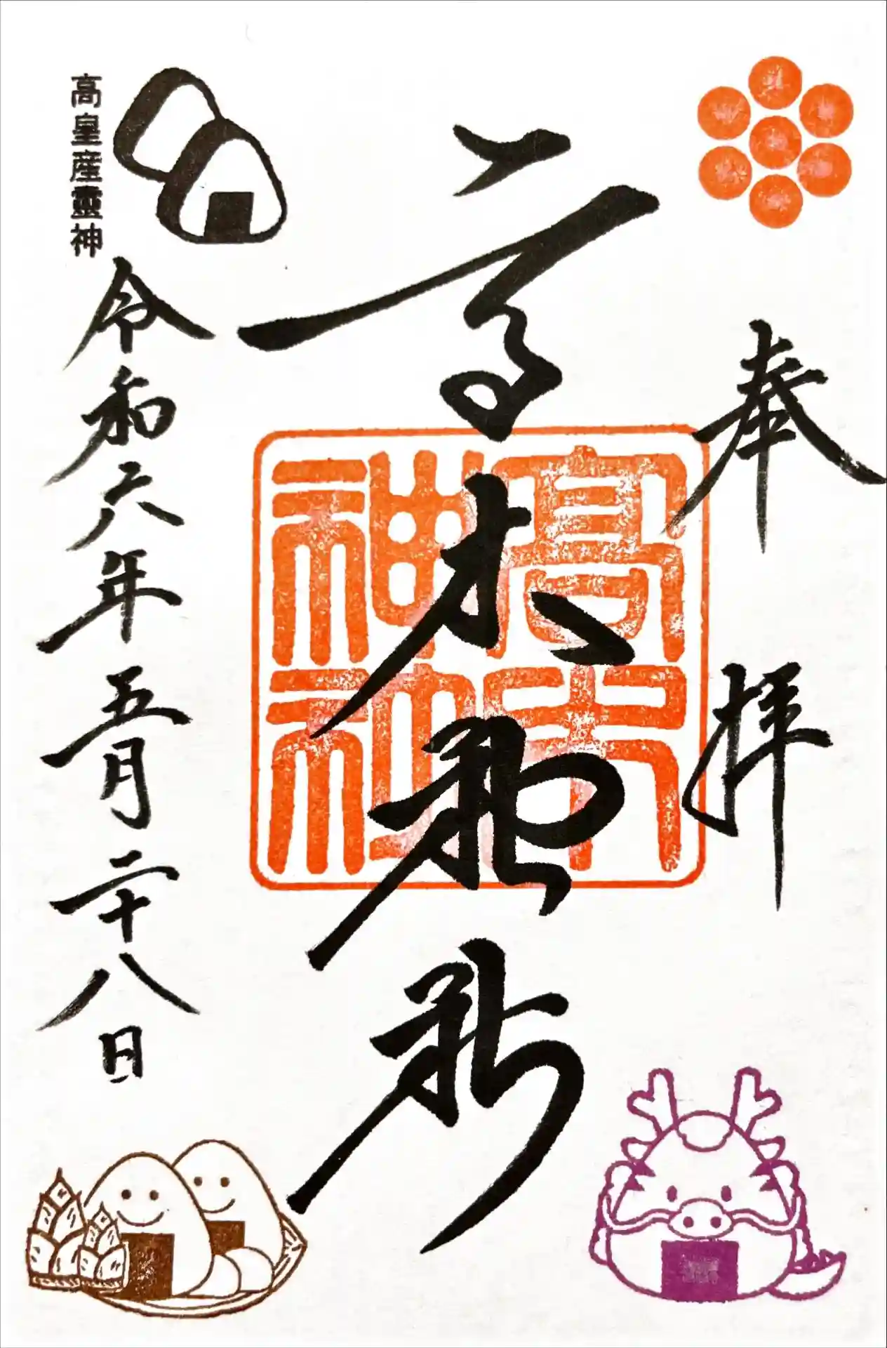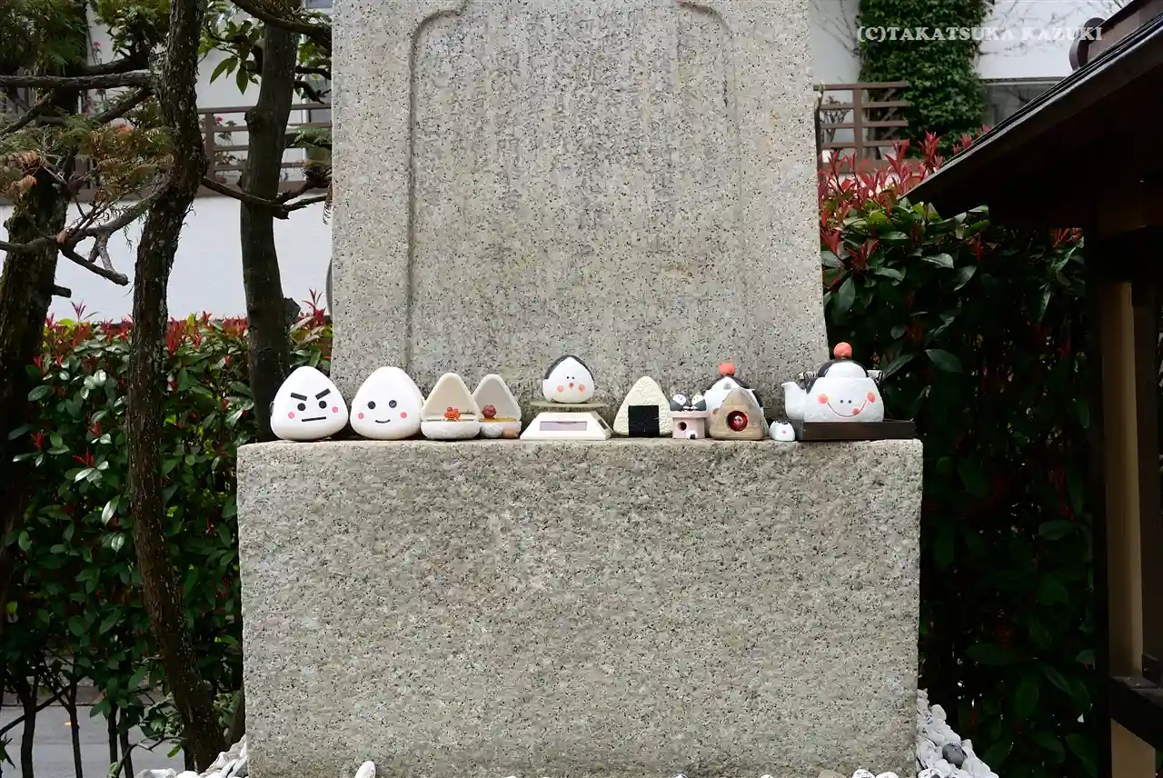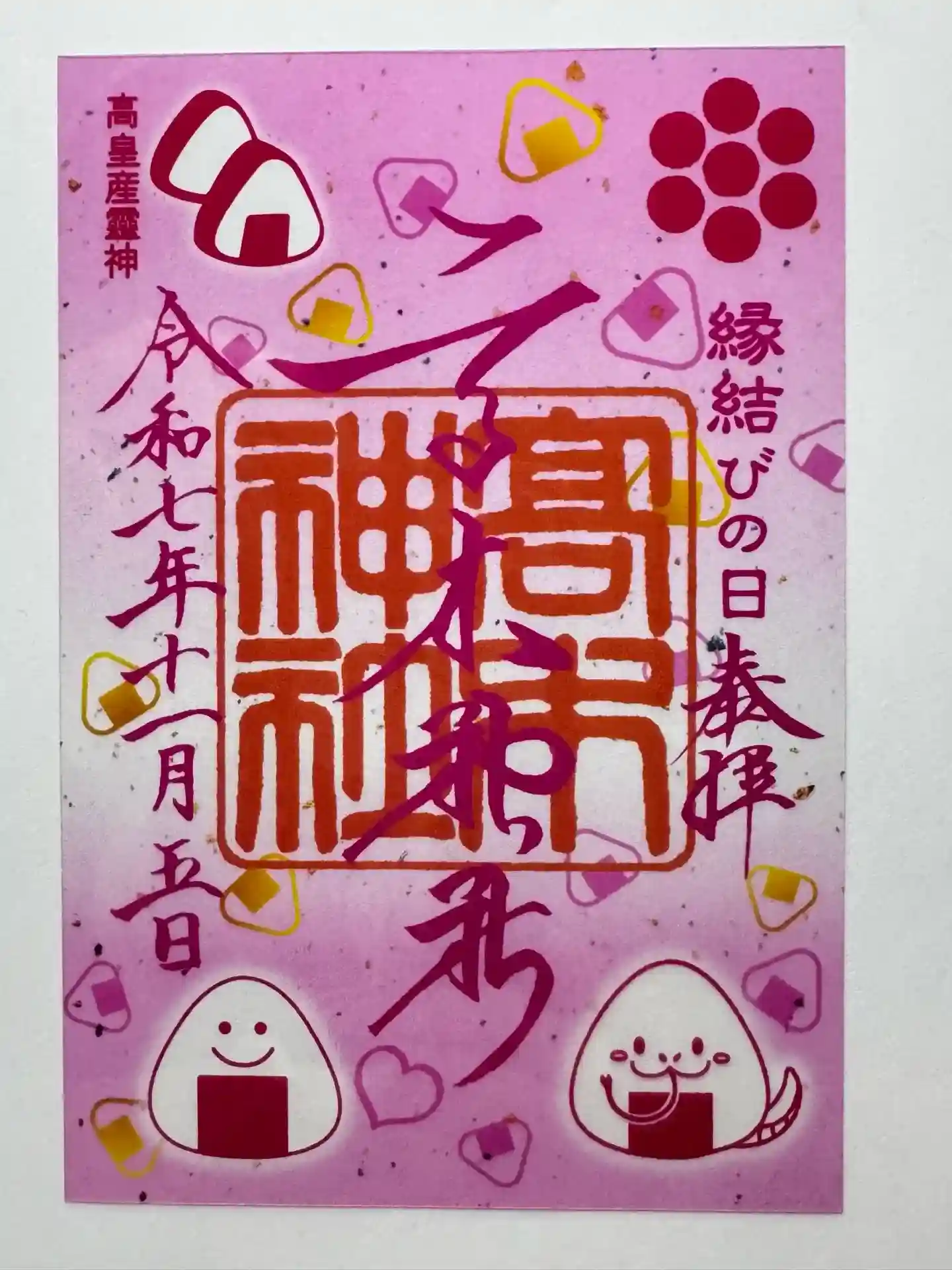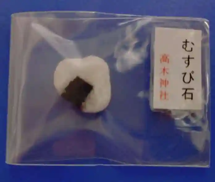 御祭神としてむすびの神の高皇産霊神(たかみむすびのかみ)を祀っている事から、「おむすび」の置き物等…