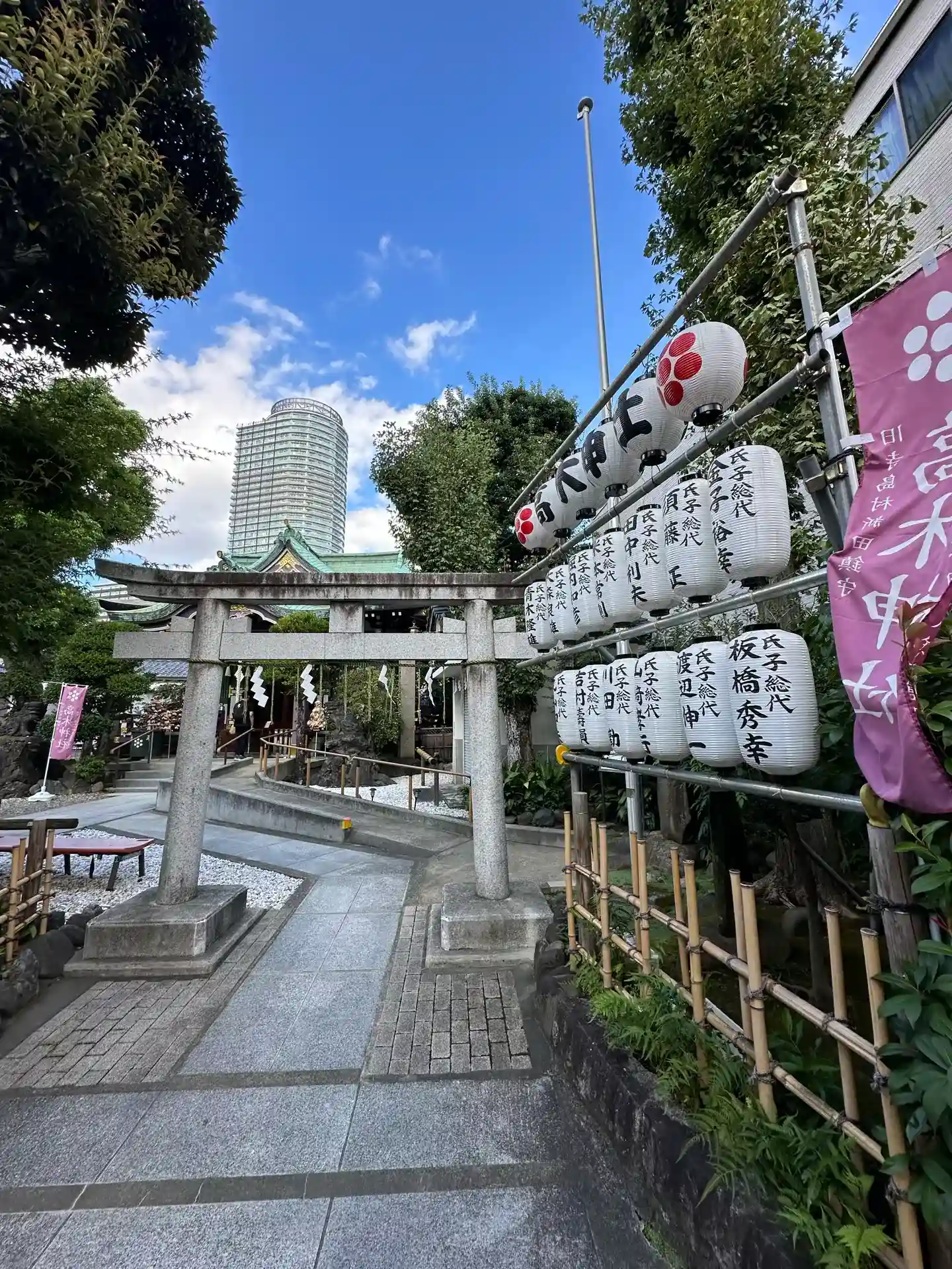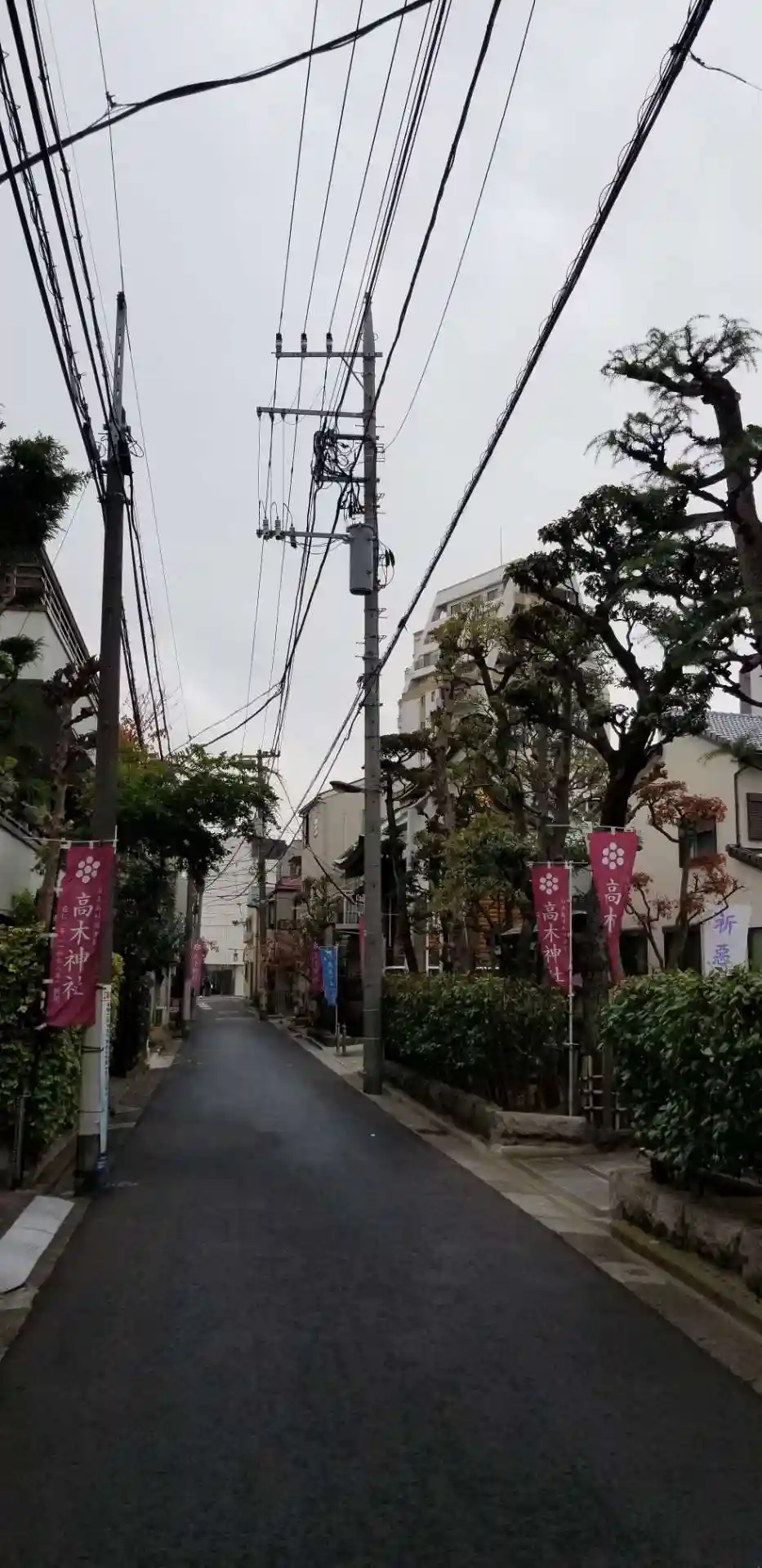 神社の名前が交差点にあり路地に入ると幟がお迎えしてくれ…