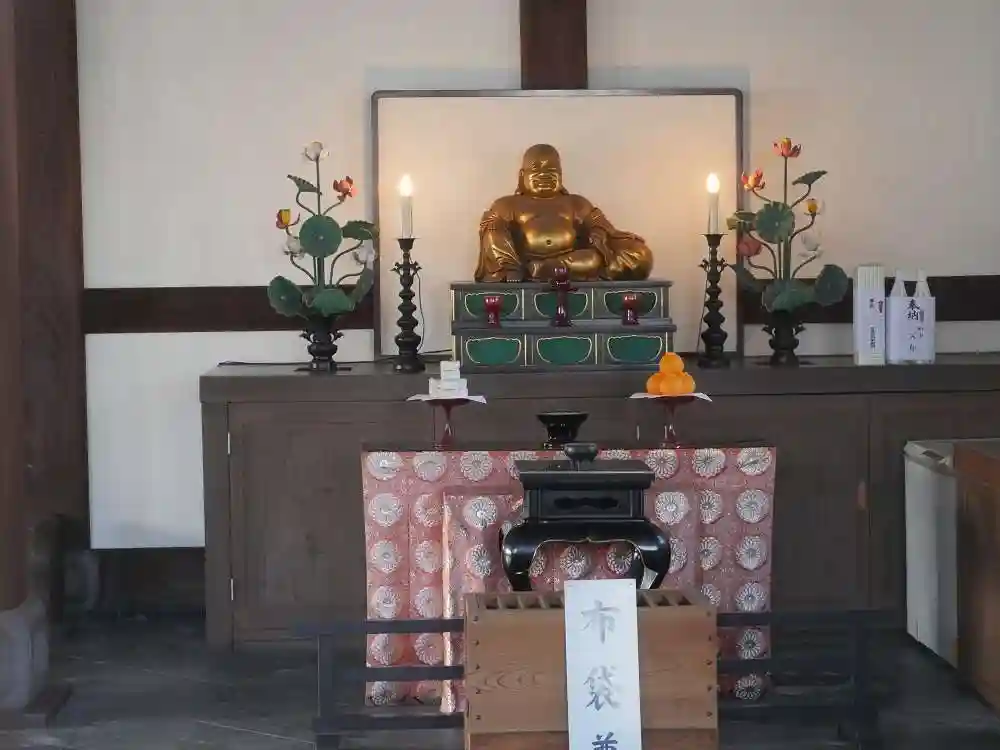 三囲神社から弘福寺へ。京都・宇治の萬福寺が本山の禅宗、黄檗宗の寺院です。江戸時代初期に日本に渡ってきた隠元が開祖の、比較的新しい宗派です。弘福寺の山門や本堂は萬福寺と同じように中国風の建築様式で、これが黄檗宗の寺院の特徴のようです。本堂の中には隅田川七福神の布袋尊があり、ドラえもんが案内しています。