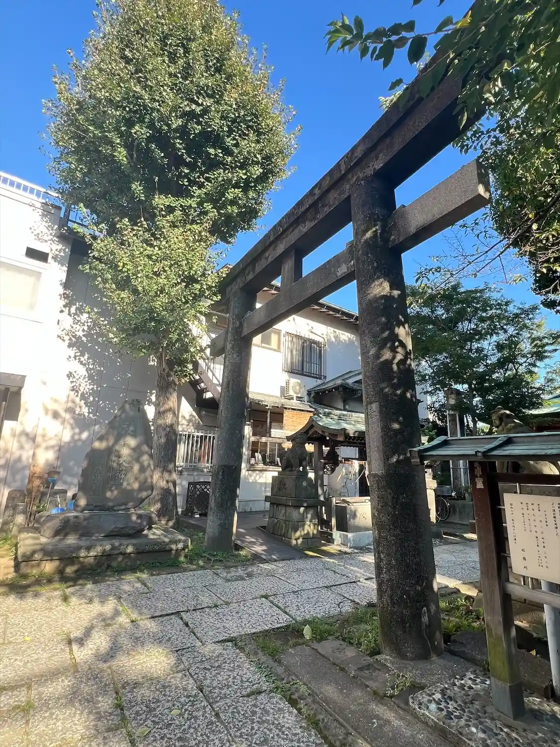 昭和な木造住宅に挟まれた狭い路地を抜けると神社が現れます。