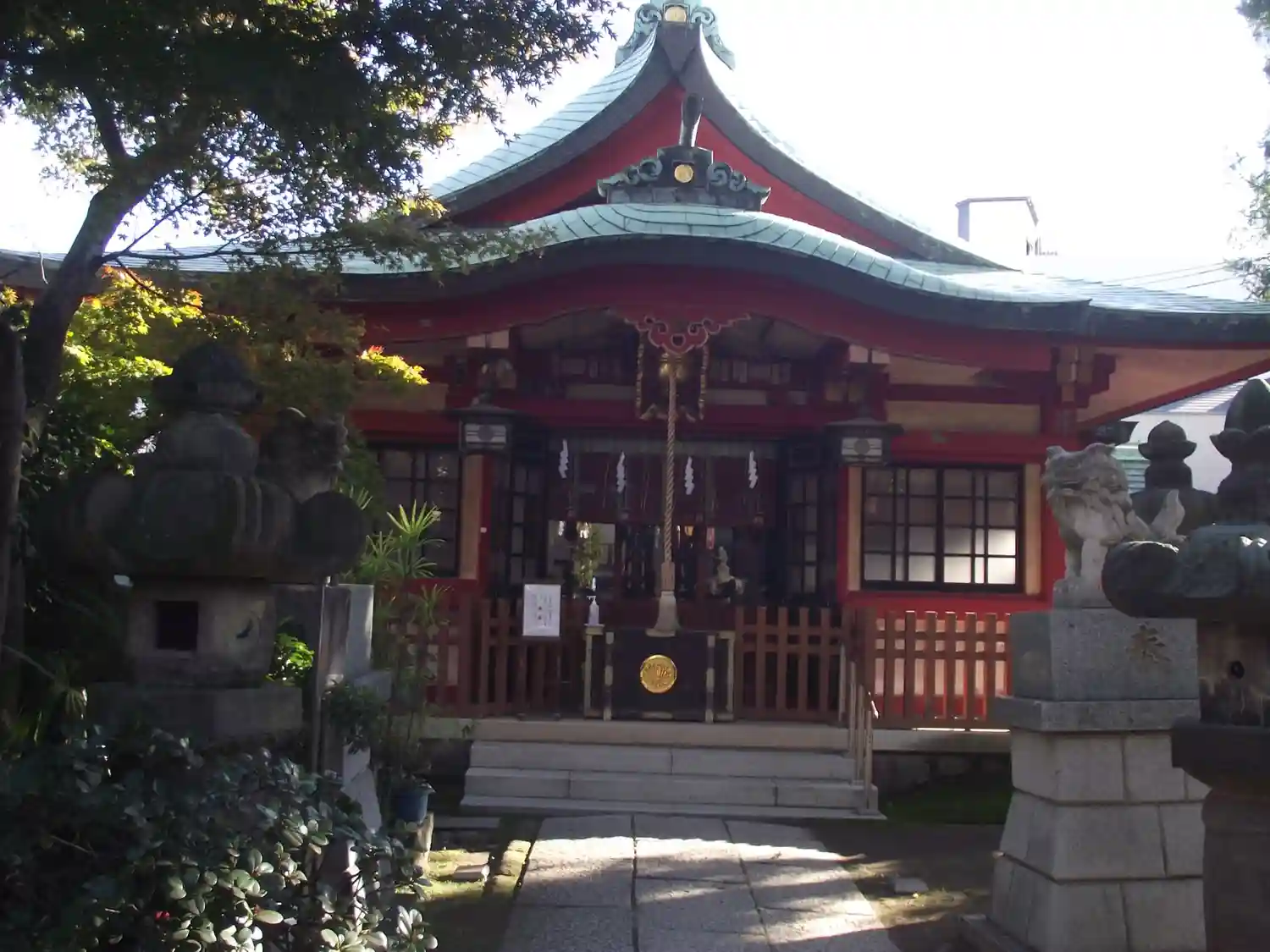 秋葉神社(向島)〜拝殿、後ろにはスカイツリー(青)