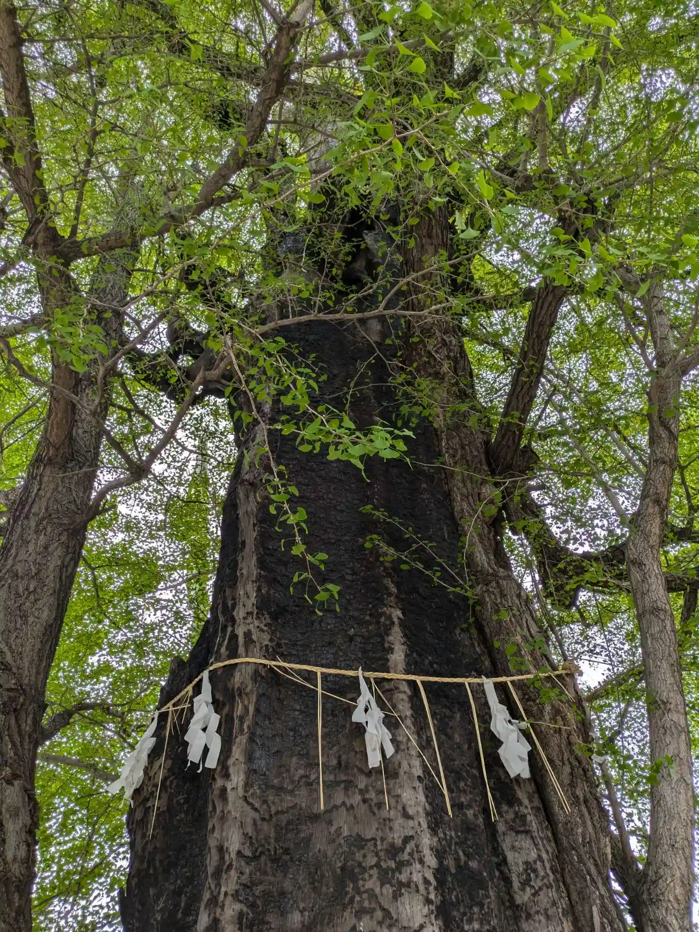 高木神社へ向かう途中で出会えた神社です。イチョウの枝が飛来したことが名称の由来とのこと。さらに幹が黒く、これは東京大空襲で被災した跡とのこと。