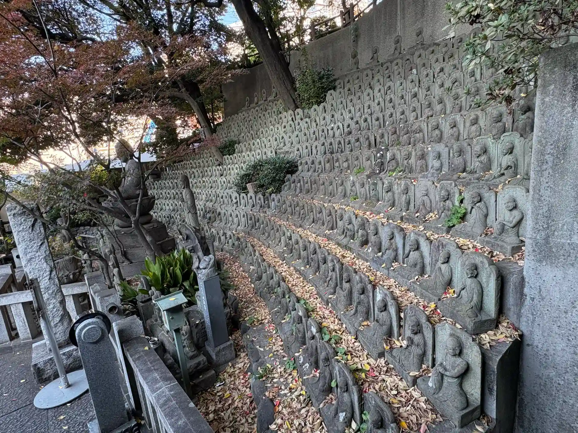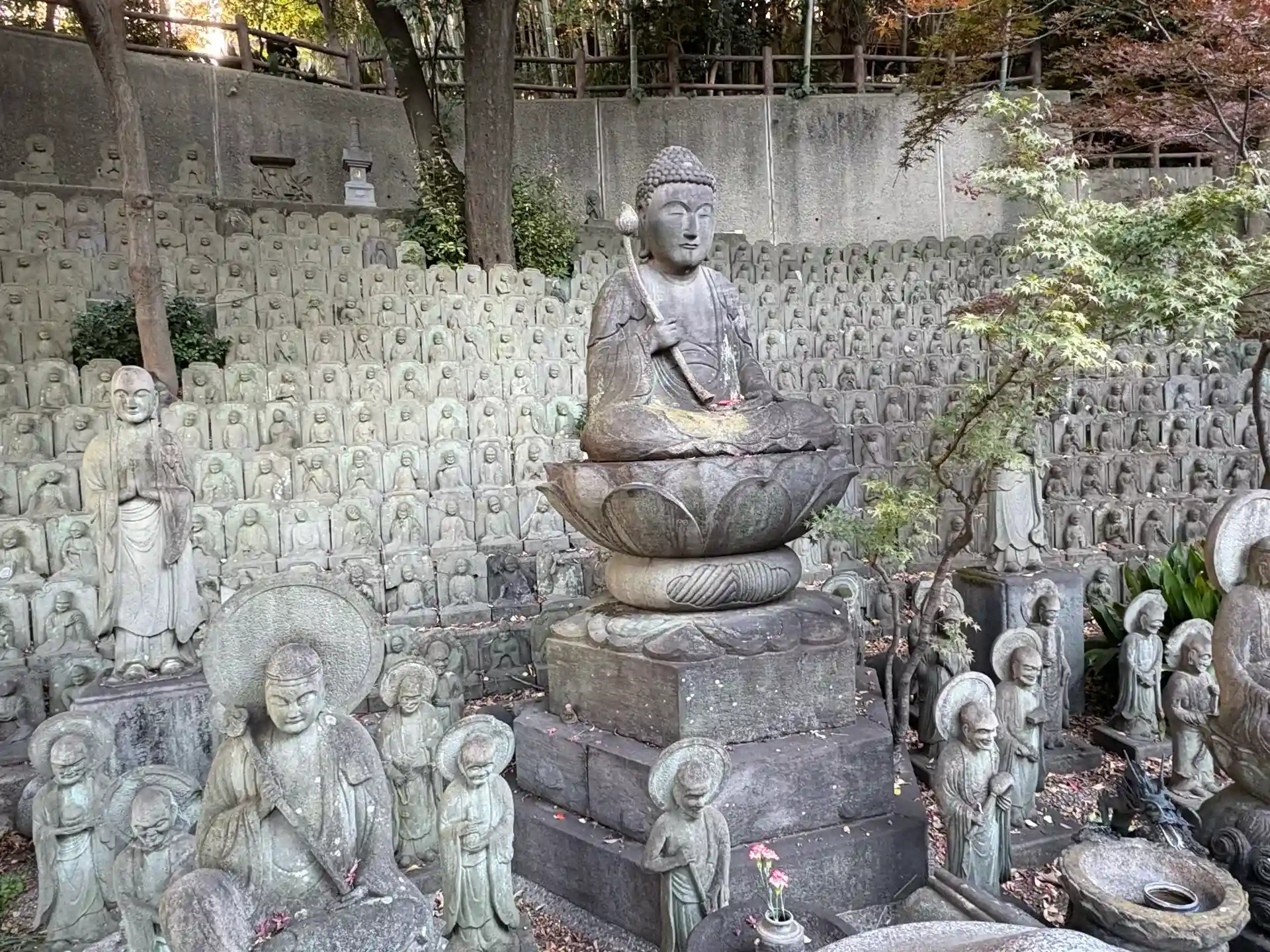 石仏群が素晴らしい。当寺を火元とする明和の「行人坂の火事」で犠牲になった人々の霊を慰めるために造立された五百羅漢、釈迦三尊、十六羅漢、十大弟子像。
