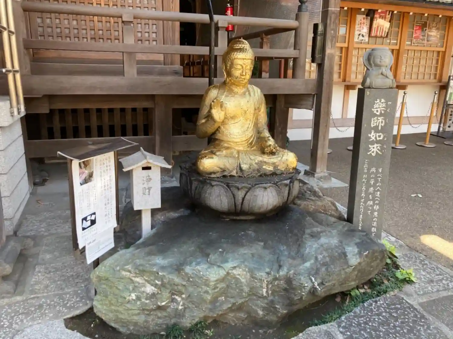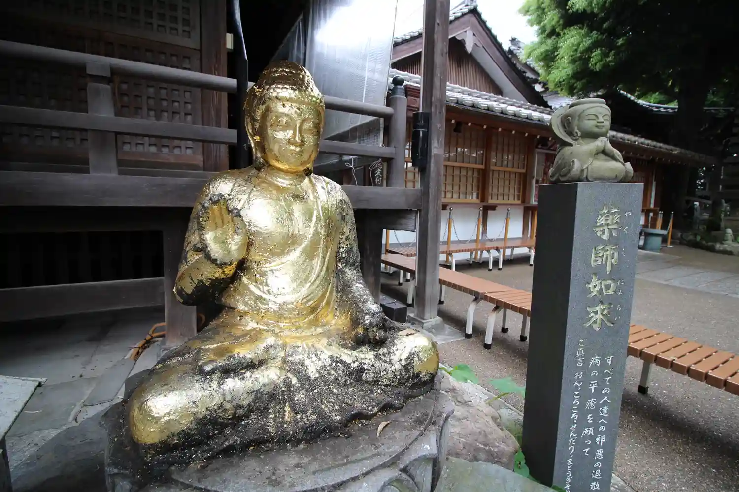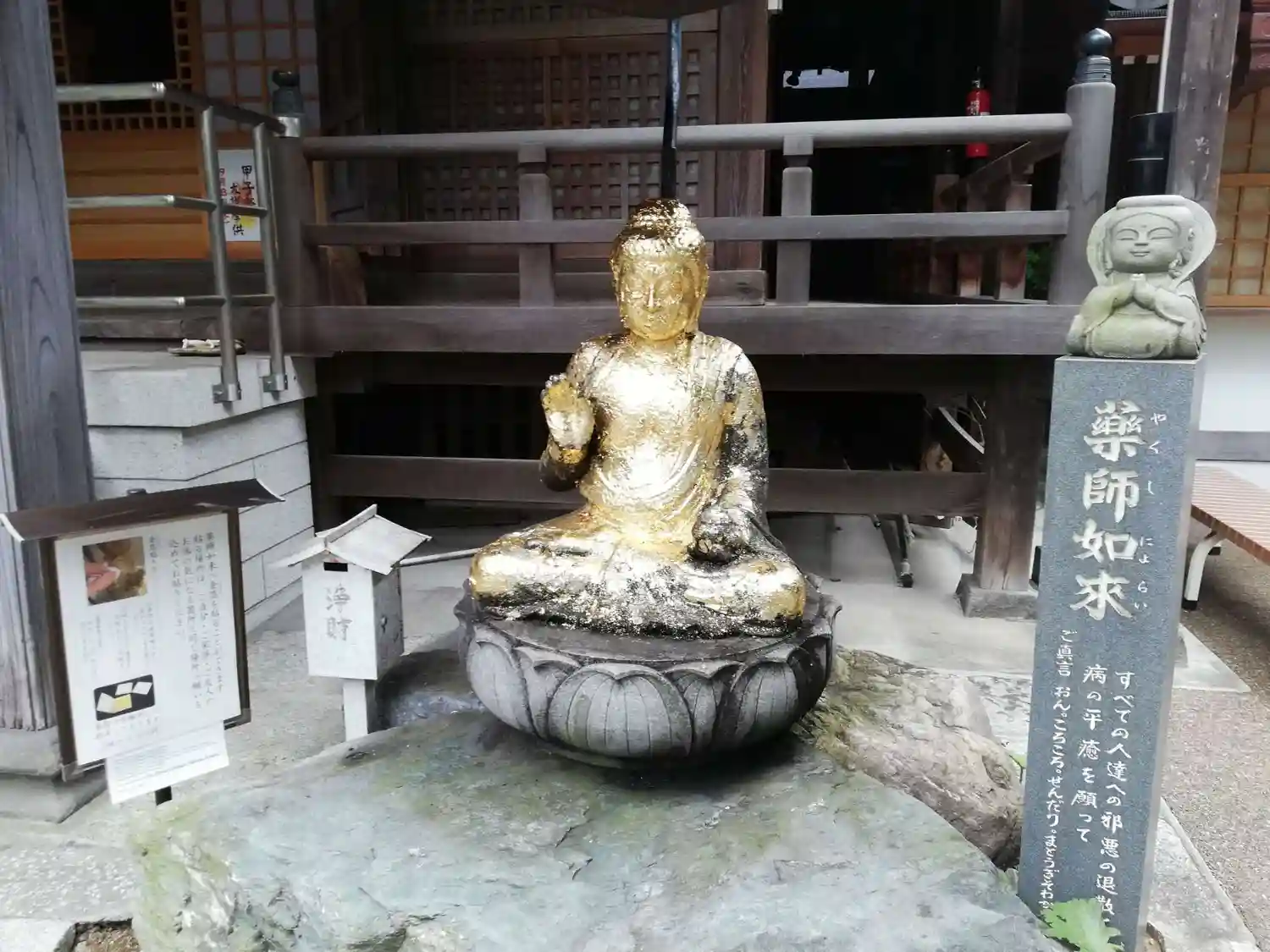 本堂右にある金ピカの薬師如来様。体の良くないところに金箔を貼って祈願すると、ご利益があるそうな。
