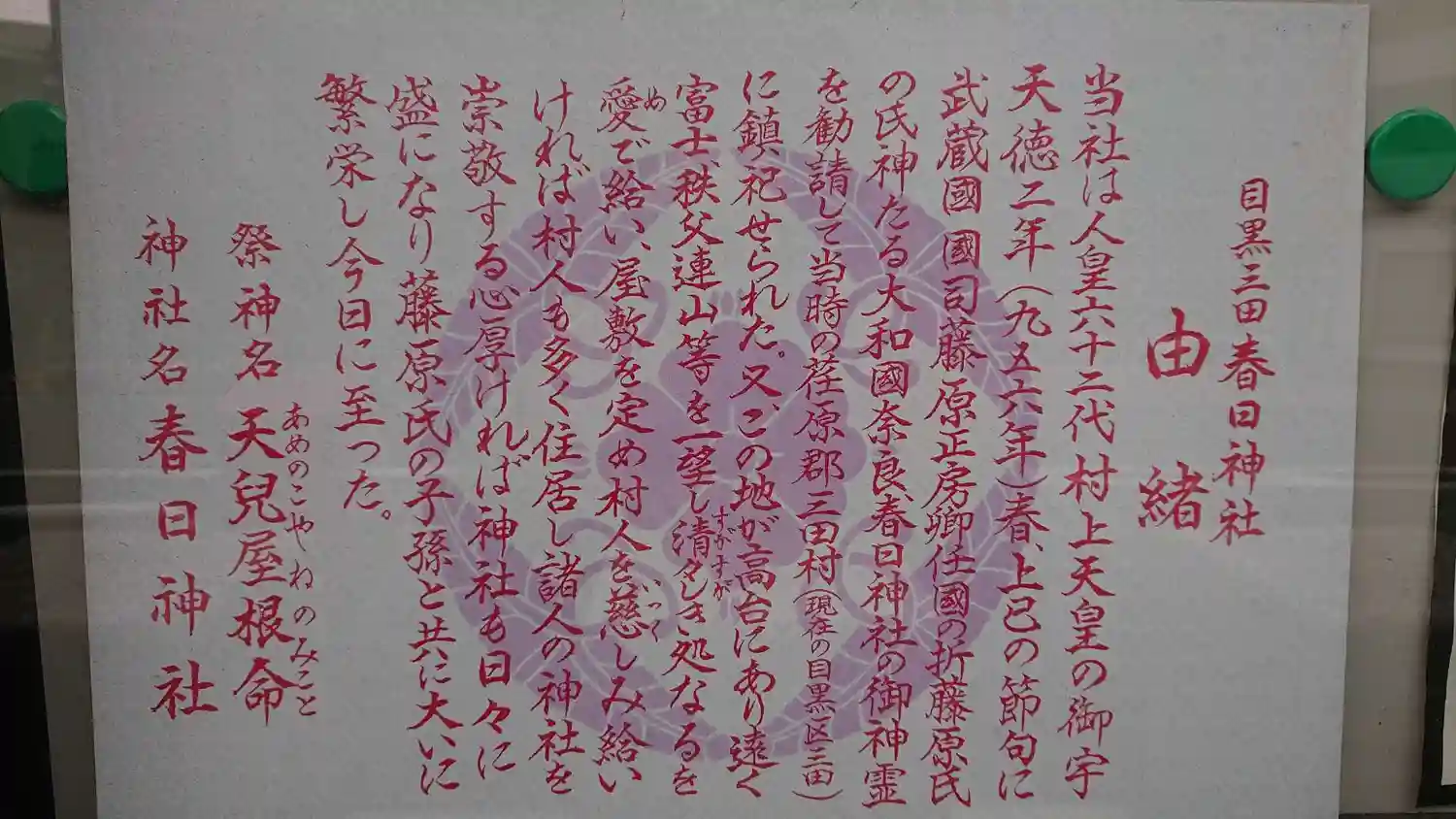 | ご由緒 | 天徳二年(958)、武蔵国国司の藤原正房が任国の際、藤原氏の氏神の春日大社の第二殿に祀る天児屋根命の御神霊を目黒区三田の勧請。後に太田道灌によって、天文年間(1533-1555)に港区三田に遷座されたが、昭和九年(1934)に元地に改めて建立された。 |